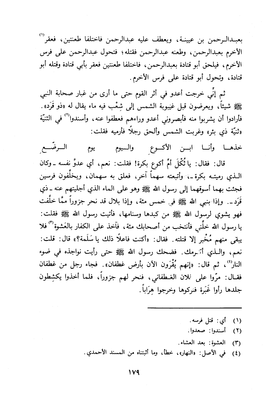قال: فقال: يا ثُكَلْ أمِّ أكوع بكرة فقلت: نعم، أي عدوَّ نفسه - وكان الذي رميته بكرة -، وأتبعته سهماً آخر، فعلق به سهمان، ويخلِّفون فرسين فجئت بهما أسوقهما إلى رسول الله صلى الله عليه وسلم وهو على الماء الذي أجليتهم عنه - ذي قَرَد -. وإذا بنبي الله صلى الله عليه وسلم في خمس مائة، وإِذا بلال قد نحر جزوراً ممَّا خلَّفت فهو يشوي لرسول الله صلى الله عليه وسلم من كبدها وسنامها، فأتيت رسول الله صلى الله عليه وسلم فقلت: يا رسول الله خلِّني فأنتخب من أصحابك مائة، فآخذ على الكفار بالعَشوة فلا يبقى منهم مُخْبر إلا قتلته. فقال: «أكنت فاعلاً ذلك يا سلَمة؟» قال: قلت: نعم، والذي أكرمك. فضحك رسول الله صلى الله عليه وسلم حتى رأيت نواجذه في ضوء (النار) ، ثم قال: «إنهم يُقْرَون الآن بأرض غطفان» فجاء من غطفان فقال: «مرّوا على فلان الغطفاني، فنحر لهم جزوراً، فلما أخذوا يكشِطون جلدها رأوا غَبَرة فتركوها وخرجوا هراباً.