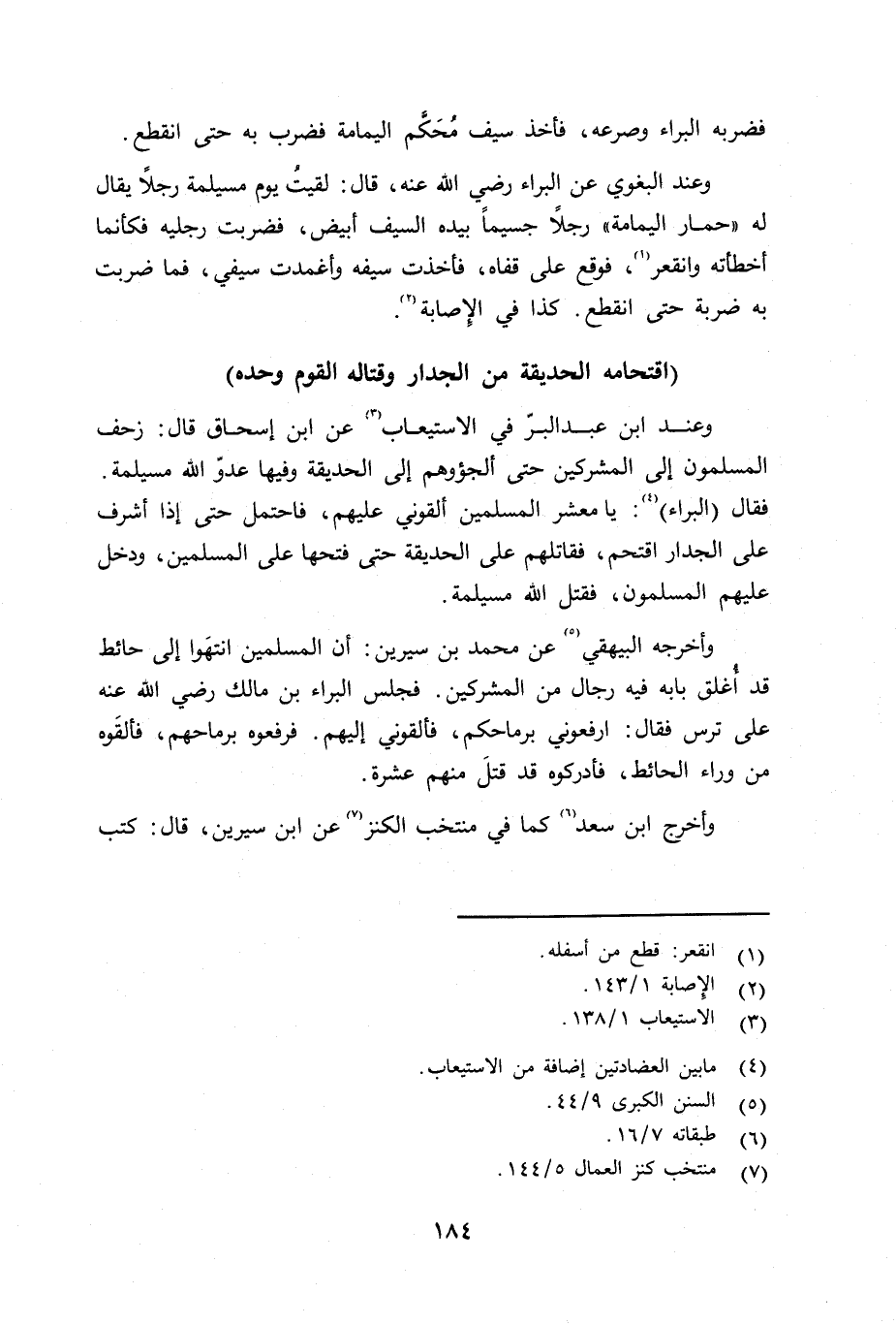 وعند البغوي عن البراء رضي الله عنه قال: لقيت يوم مسيلمة رجلاً يقال له «حمار اليمامة» رجلاً جسيماً بيده السيف أبيض، فضربت رجليه فكأنما أخطأته وانقعر، فوقع على قفاه، فأخذت سيفه وأغمدت سيفي، فما ضربت به ضربة حتى انقطع. كذا في الإِصابة.