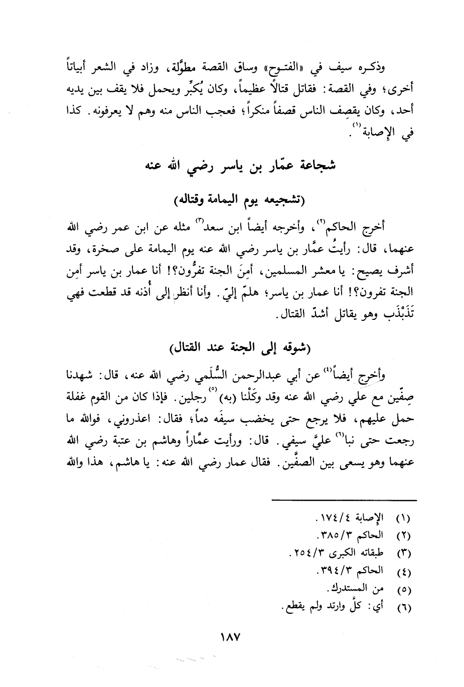 وأخرج أيضاً عن أبي عبد الرحمن السُّلَمي رضي الله عنه قال: شهدنا صِفّين مع علي رضي الله عنه وقد وَكَلنا (به) رجلين. فإذا كان من القوم غفلة حمل عليهم، فلا يرجع حتى يخضب سيفَه دماً؛ فقال: أعذروني، فوالله ما رجعت حتى نبا عليَّ سيفي. قال: ورأيت عمَّاراً وهاشم بن عتبة رضي الله عنهما وهو يسعى بين الصفَّين. فقال عمار رضي الله عنه: يا هاشم، هذا والله