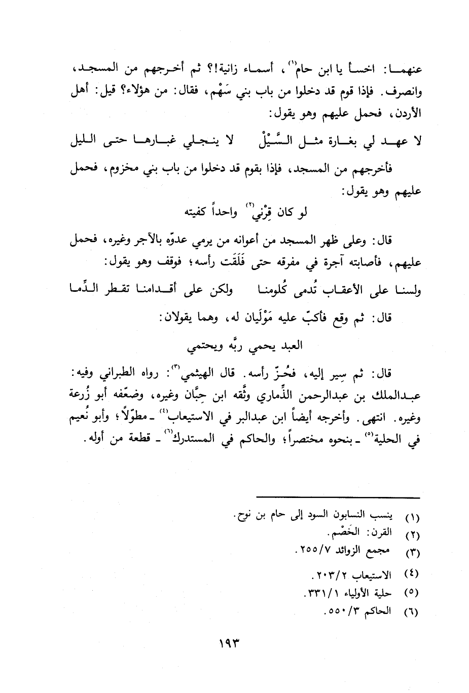 قال: ثم سِير إِليه، فحُزّ رأسه. قال الهيثمي رواه الطبراني وفيه: عبد الملك بن عبد الرحمن الذماري وثَّقه ابن حِبَّان وغيره، وضعفّه أبو زُرعة وغيره. انتهى. وأخرجه أيضاً ابن عبد البرّ في الاستيعاب - مطوّلاً؛ وأبو نُعيم في الحلية - بنحوه مختصراً؛ (والحاكم في المستدرك - قطعة من أوله.