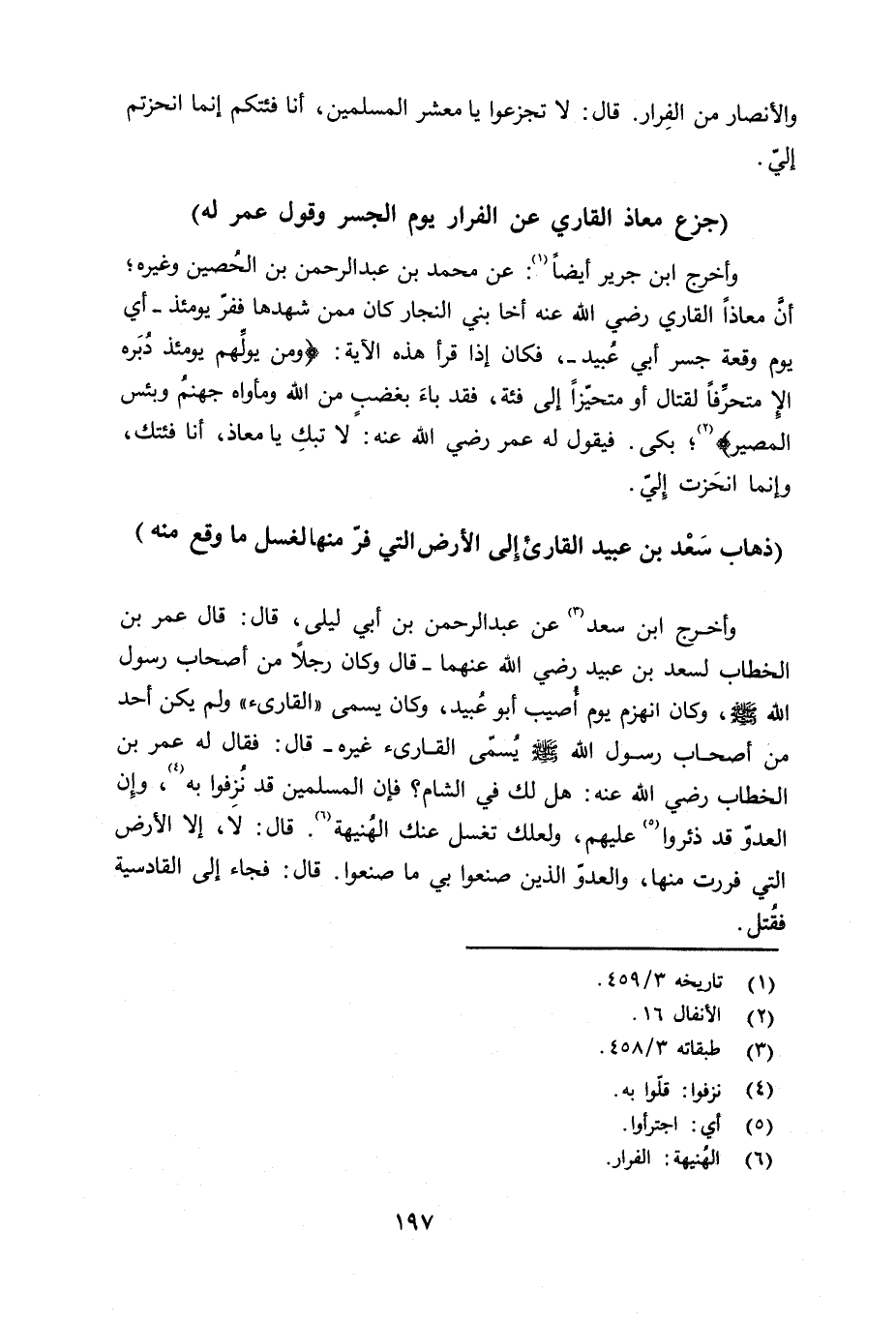 وأخرج ابن جرير أيضاً: عن محمد بن عبد الرحمن بن الحصين وغيره: أنَّ معاذ القاري رضي الله عنه أخا بني النجار كان ممن شهدها ففرّ يومئذٍ - أي يوم وقعة جسر أبي عبيد -، فكان إذا قرأ هذه الآية: {وَمَن يُوَلّهِمْ يَوْمَئِذٍ دُبُرَهُ إِلاَّ مُتَحَرّفاً لّقِتَالٍ أَوْ مُتَحَيّزاً إِلَى فِئَةٍ فَقَدْ بَآء بِغَضَبٍ مّنَ اللَّهِ وَمَأْوَاهُ جَهَنَّمُ وَبِئْسَ الْمَصِيرُ} (الأنفال: 16) ؛ بكى. فيقول له عمر رضي الله عنه: لا تبكِ يا معاذ، أنا فئتك، وإنما انحَزت إِليّ.
