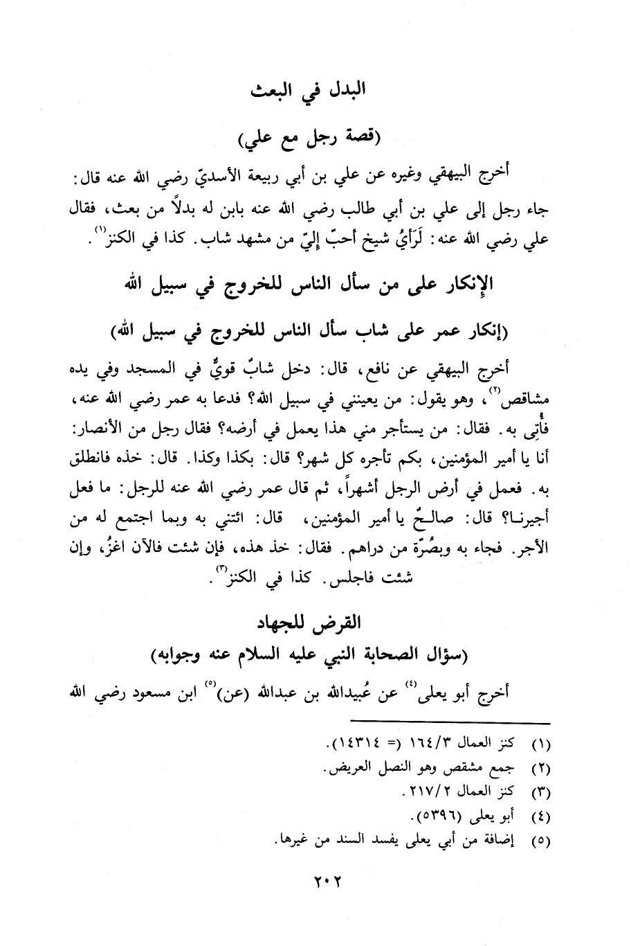 أخرج البيهقي وغيره عن علي بن أبي ربيعة الأسديّ رضي الله عنه قال: جاء رجل إلى علي بن أبي طالب رضي الله عنه بابن له بدلاً من بعث، فقال علي رضي الله عنه: لَرَأيُ شيخ أحب إِليّ من مشهد شاب. كذا في الكنز.