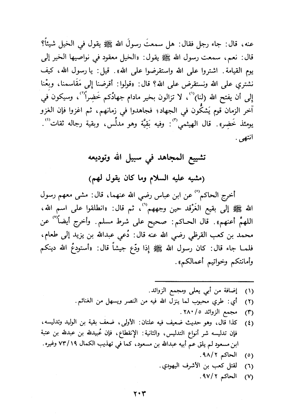 عنه قال: جاء رجل فقال: هل سمعت رسول الله صلى الله عليه وسلم يقول في الخيل شيئاً؟ قال: نعم، سمعت رسول الله صلى الله عليه وسلم يقول: «الخيل معقود في نواصيها الخير إلى يوم القيامة. اشتروا على الله واستقرضوا على الله» . قيل: يا رسول الله، كيف نشتري على الله ونستقرض على الله؟ قال: «قولوا: أقرضنا إِلى مقاسمنا، وبِعْنا إِلى أن يفتح الله (لنا) ، لا تزالون بخير ما دام جهادكم خَضِراً، وسيكون في آخر الزمان قوم يشكّون في الجهاد؛ فجاهدوا في زمانهم، ثم اغزوا فإن الغزو يومئذٍ خَضِر» . قال الهيثمي: وفيه بَقِيَّة وهو مدلِّس، وبقية رجاله ثقات. انتهى.