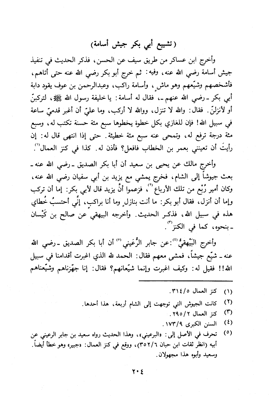 وأخرج مالك عن يحيى بن سعيد أن أبا بكر الصديق - رضي الله عنه - بعث جيوشاً إلى الشام، فخرج يمشي مع يزيد بن أبي سفيان رضي الله عنه، وكان أمير رُبْع من تلك الأرباع، فزعموا أنّ يزيد قال لأبي بكر: إما أن تركب وإما أن أنزل، فقال أبو بكر: ما أنت بنازل وما أنا براكب، إِنِّي أحتسب خطاي هذه في سبيل الله - فذكر الحديث. وأخرجه البيهقي عن صالح بن كَيْسان - بنحوه، كما في الكنز.