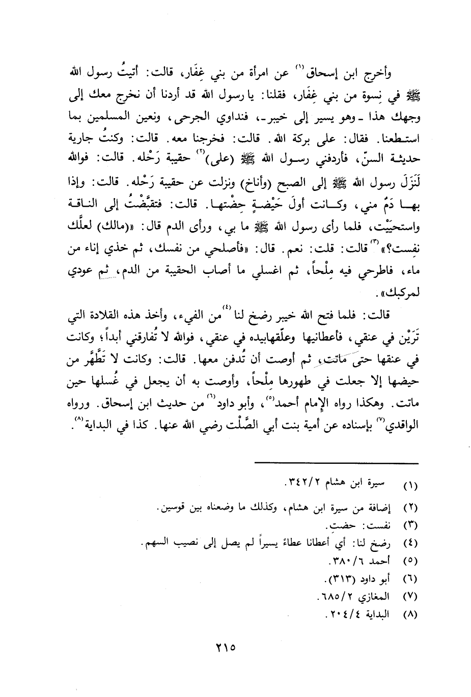 وأخرج ابن إسحاق عن إمرأة من بني غِفَار قالت: أتيت رسول الله صلى الله عليه وسلم في نِسوة من بني غِفَار، فقلنا: يا رسول الله قد أردنا أن نخرج معك إلى وجهك هذا - وهو يسير إِلى خيبر -، فنداوي الجرحى، ونعين المسلمين بما استطعنا. فقال: على بركة الله. قالت: فخرجنا معه. قالت: وكنت جارية حديثة السنّ، فأردفني رسول الله صلى الله عليه وسلم (على) حقيبة رَحْله. قالت: فوالله لَنَزَل رسول الله صلى الله عليه وسلم إلى الصبح (وأناخ) ونزلت عن حقيبة رَحْله. قالت: وإذا به دَمٌ مني، وكانت أولَ حَيْضةٍ حِضْتها. قالت: فتقبَّضْتُ إلى الناقة واستحيَيْت، فلما رأى رسول الله صلى الله عليه وسلم ما بي، ورأى الدم قال: « (مالك) لعلَّك نفِست؟» قالت: قلت: نعم. قال: «فأصلحي من نفسك، ثم خذي إِناء من ماء، فاطرحي فيه مِلْحاً، ثم اغسلي ما أصاب الحقيبة من الدم، ثم عودي لمركبك» .