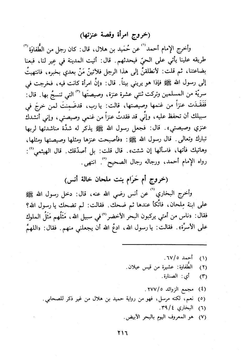 وأخرج البخاري عن أنس رضي الله عنه قال: دخل رسول الله صلى الله عليه وسلم على إبنة مِلحان، فاتَّكأ عندها ثم ضحك. فقالت: لم تضحك يا رسول الله؟ فقال: «ناس من أمتي يركبون البحر الأخضر في سبيل الله، مَثَلُهم مَثَلُ الملوك على الأسرة» . فقالت: يا رسول الله، أدعُ الله أن يجعلني منهم. فقال: «اللهمَّ