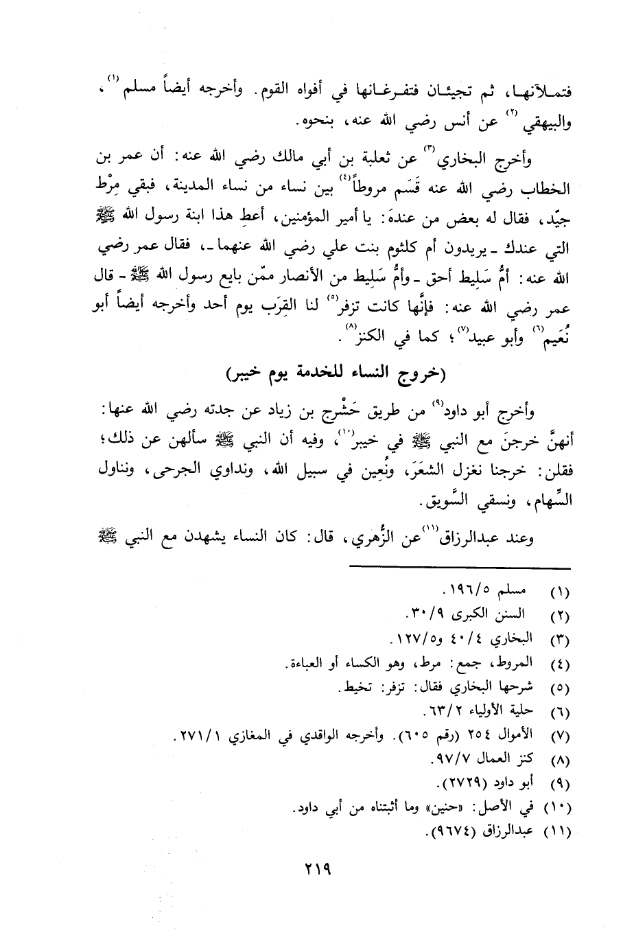 وأخرج أبو داود من طريق حَشْرج بن زياد عن جدته (- أم أبيه -) رضي الله عنها: أنهنَّ خرجنَ مع النبي صلى الله عليه وسلم في خيبر، وفيه أن النبي صلى الله عليه وسلم سألهن عن ذلك؛ فقلن خرجنا نغزل الشعَرَ، فنعين به في سبيل الله، ونداوي الجرحى، ونناول السِّهام، ونسقي السَّويق.