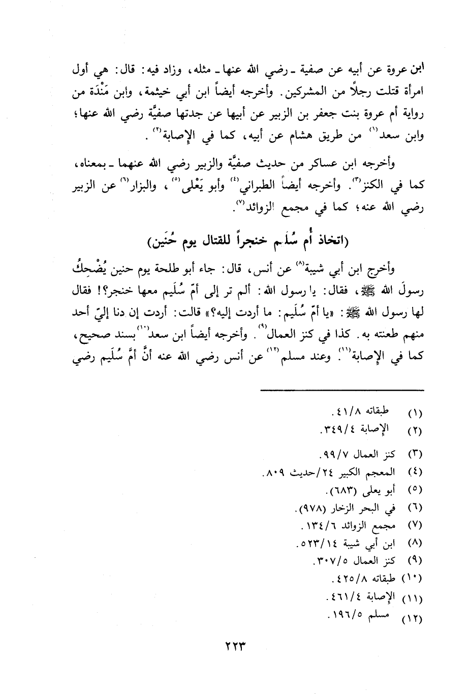 بن عروة عن أبيه عن صفية - رضي الله عنهم - مثله، وزاد فيه: قال: هي أول إمرأة قتلت رجلاً من المشركين. وأخرجه أيضاً ابن أبي خيثمة، وابن مَنْدَه من رواية أم عروة بنت جعفر بن الزبير عن أبيها عن جدتها صفيَّة رضي الله عنها؛ وابن سعد من طريق هشام عن أبيه، كما في الإِصابة. وأخرجه ابن عساكر من حديث صفيَّة والزبير رضي الله عنهما - بمعناه، كما في الكنز. وأخرجه أيضاً الطبراني؛ عن عروة) وأبو يَعْلى، والبزار عن الزبير رضي الله عنه (وإسنادهما ضعيف) ؛ كما في مجمع الزوائد.