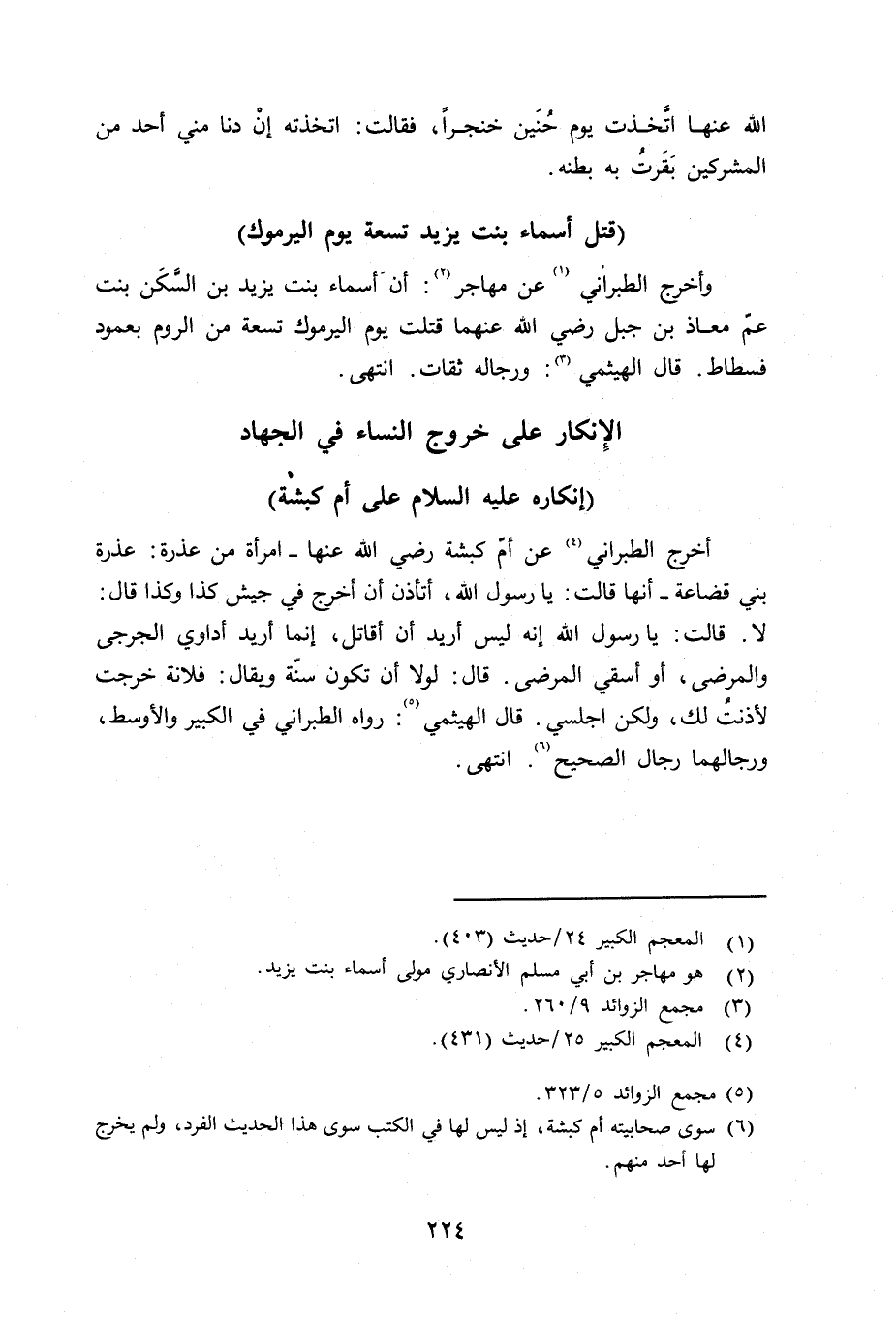 وأخرج الطبراني عن مهاجر: أن أساء بنت يزيد بن السَّكَن بنت عمّ معاذ بن جبل رضي الله عنهما قتلت يوم اليرموك تسعة من الروم بعمود فسطاط. قال الهيثمي: ورجاله ثقات: انتهى.