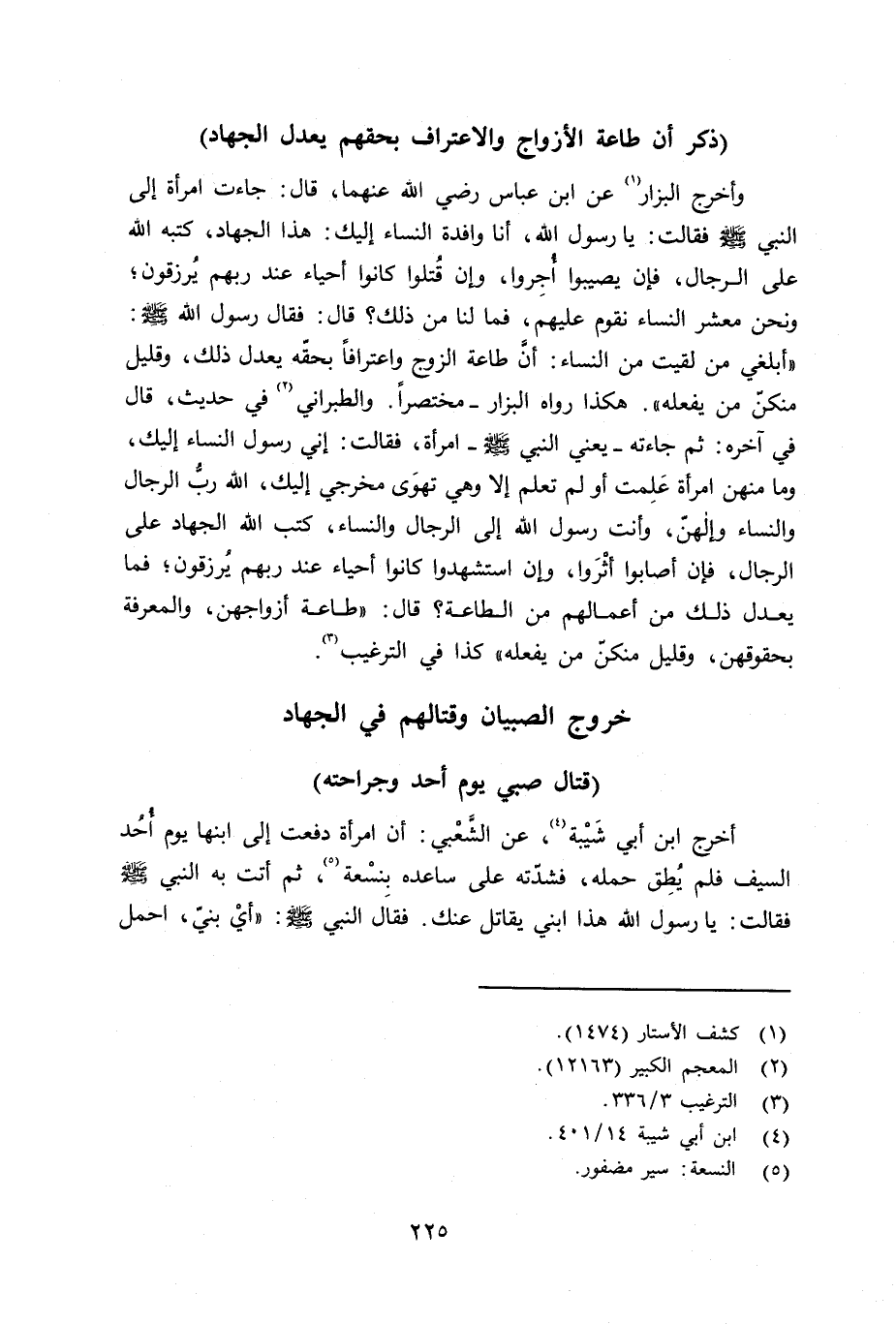 وأخرج البزار عن ابن عباس رضي الله عنهما قال: جاءت إمرأة إلى النبي صلى الله عليه وسلم فقالت: يا رسول الله، أنا وافدة النساء إليك: هذا الحهاد، كتبه الله على الرجال، فإن يصيبوا أُجِروا، إن قُتلوا كانوا أحياء عند ربهم يُرزقون؛ ونحن معشر النساء نقوم عليهم، فما لنا من ذلك؟ قال: فقال رسول الله صلى الله عليه وسلم «أبلغي من لقيت من النساء: أنَّ طاعة الزوج واعترافاً بحقّه يعدل ذلك، وقليل منكنّ من يفعله» . وهكذا رواه البزار - مختصراً.