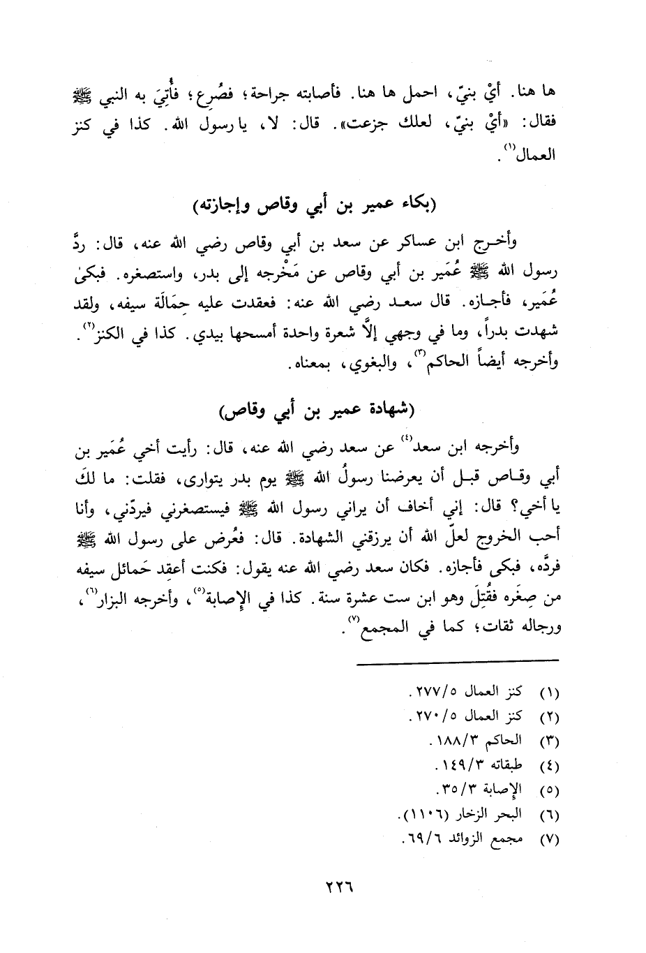 وأخرجه ابن سعد عن سعد رضي الله عنه قال: رأيت أخي عُمَير بن أبي وقاص قبل أن يعرضنا رسول الله صلى الله عليه وسلم يوم بدر يتوارى، فقلت: ما لك يا أخي؟ قال: إني أخاف أن يراني رسول الله صلى الله عليه وسلم فيستصغرني فيردّني، وأنا أحب الخروج لعلّ الله أن يرزقني الشهادة. قال: فعُرض على رسول الله صلى الله عليه وسلم فردَّه، فبكى فأجازه. فكان سعد رضي الله عنه يقول: فكنت أعقِد حَمائل سيفه من صِغره فقتل وهو ابن ست عشرة سنة. كذا في الإِصابة، وأخرجه البزار، ورجاله ثقات؛ كما في المجمع.
