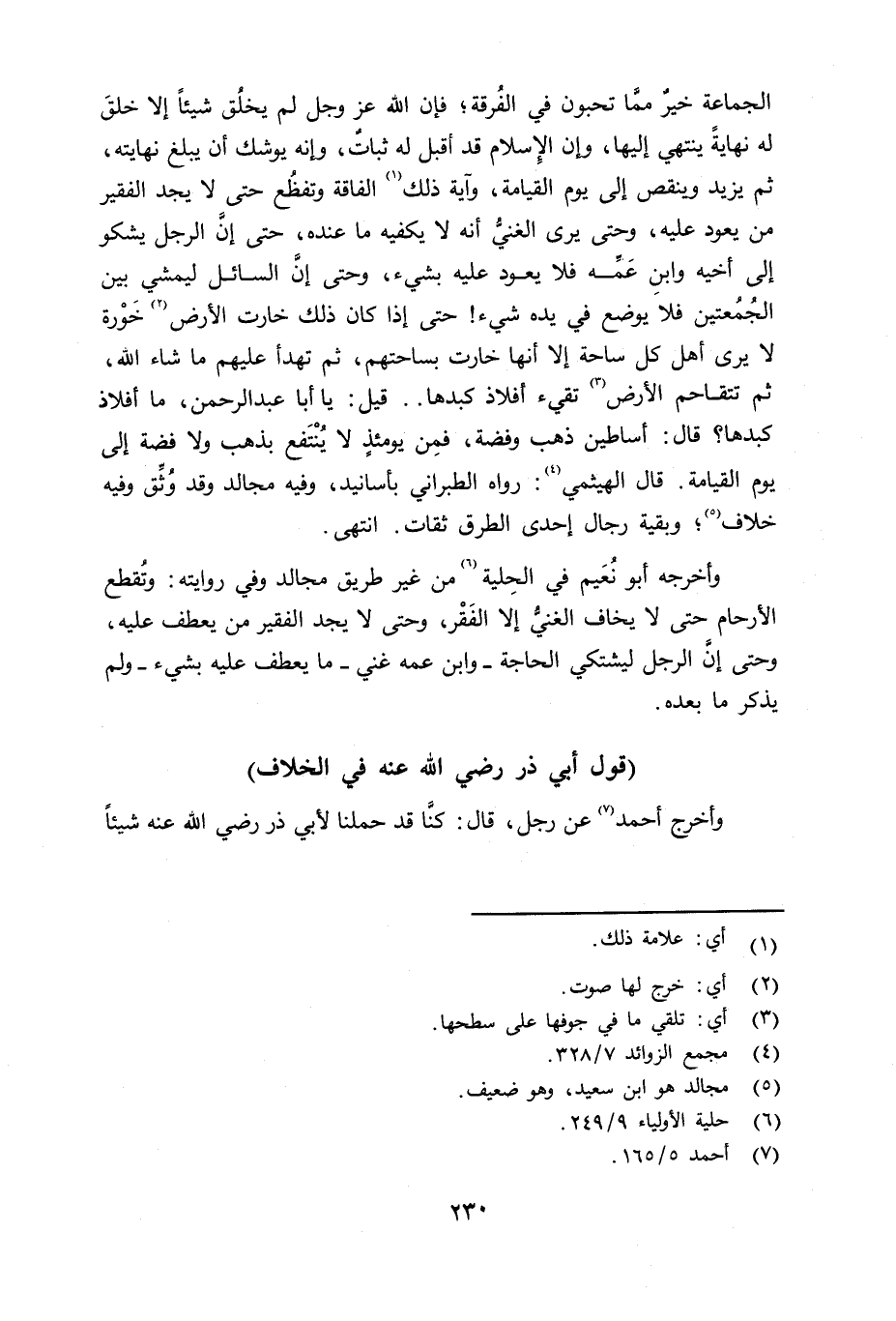 الجماعة خيرٌ ممَّا تحبون في الفُرقة؛ فإن الله عزّ وجلّ لم يخلُق شيئاً إلا خلق له نهاية ينتهي إليها، وإن الإِسلام قد أقبل له ثبات، وإنه يوشك أن يبلغ نهايته، ثم يزيد وينقص إلى يوم القيامة، وآية ذلك الفاقة وتفظُع حتى لا يجد الفقير من يعود عليه، وحتى يرى الغني أنه لا يكفيه ما عنده، حتى إنَّ الرجل يشكو إلى أخيه وابن عمه فلا يعود عليه بشيء، وحتى إنَّ السائل ليمشي بين الجمعتين فلا يوضع في يده شيء حتى إذا كان ذلك خارت الأرض خَوْرة لا يرى أهل كل ساحة إلا أنها خارت بساحتهم، ثم تهدأ عليهم ما شاء الله، ثم تتقاحم الأرض تقيء أفلاذ كبدها. قيل: يا أبا عبد الرحمن، ما أفلاذ كبدها؟ قال: أساطين ذهب وفضة، فمِن يومئذٍ لا يُنْتَفَع بذهب ولا فضة إلى يوم القيامة. قال الهيثمي: رواه الطبراني بأسانيد، وفيه مجالد وقد وُثِّق وفيه خلاف؛ وبقية رجال إحدى الطرق ثقات. انتهى.