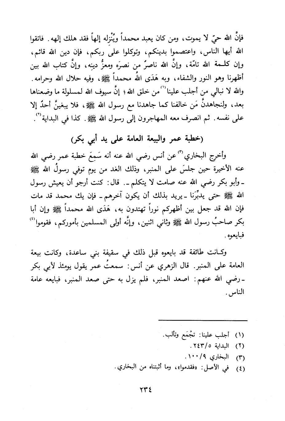 وأخرج البخاري عن أنس رضي الله عنه أنه سمع خطبة عمر رضي الله عنه الأخيرة حين جلس على المنبر، وذلك الغد من يوم توفي رسولُ الله صلى الله عليه وسلم ـ وأبو بكر رضي الله عنه صامت لا يتكلم -. قال: كنت أرجو أن يعيش رسول الله صلى الله عليه وسلم حتى يدبِّرَنا - يريد بذلك أن يكون آخرهم - فإن يكُ محمد قد مات فإن الله قد جعل بين أظهركم نوراً تهتدون به، هدى الله محمداً صلى الله عليه وسلم وإن أبا بكر صاحبُ رسول الله صلى الله عليه وسلم وثاني إثنين، وإنَّه أولى المسلمين بأموركم، فقوموا فبايعوه.