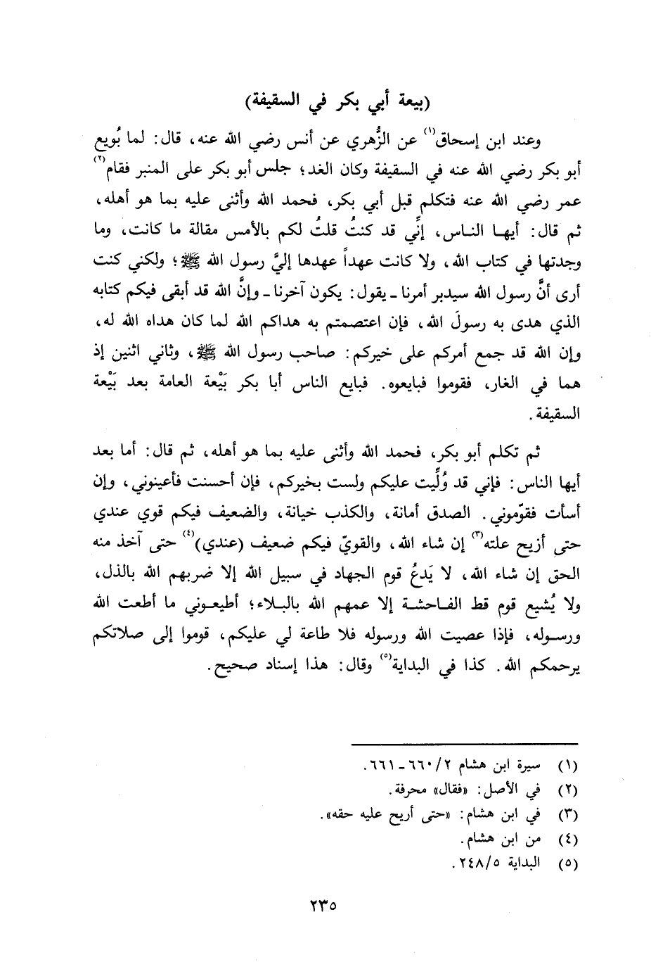 ثم تكلم أبو بكر، فحمد الله وأثنى عليه با هو أهله، ثم قال: أما بعد أيها الناس: فإني قد وُلِّيت عليكم ولست بخيركم، فإن أحسنت فأعينوني، وإن أسأت فقوّموني. الصدق أمانة، والكذب خيانة، والضعيف فيكم قوي عندي حتى أزيح علته إن شاء الله، والقويّ فيكم ضعيف (عندي) حتى آخذ منه الحق إن شاء الله، لا يَدع قوم الجهاد في سبيل الله إلا ضربهم الله بالذل، ولا يُشيع قوم قط الفاحشة إلا عمهم الله بالبلاء؛ أطيعوني ما أطعت الله ورسوله، فإذا عصيت الله ورسوله فلا طاعة لي عليكم، قوموا إلى صلاتكم يرحمكم الله. كذا في البداية وقال: هذا إسناد صحيح.