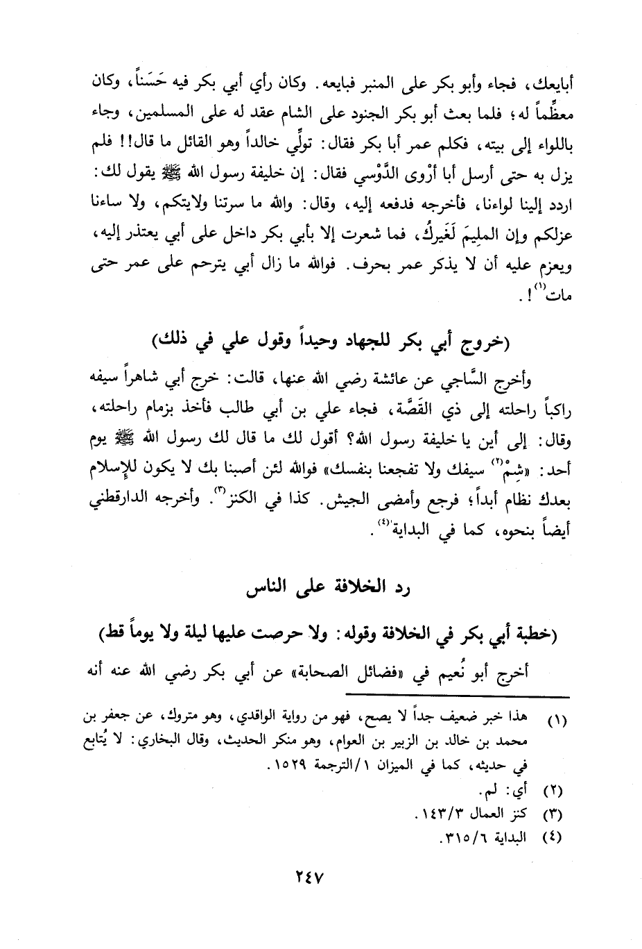 وأخرج السَّاجي عن عائشة رضي الله عنها قالت: خرج أبي شاهراً سيفه راكباً راحلته إلى ذي القَصَّة، فجاء علي بن أبي طالب فأخذ بزمام راحلته وقال: إلى أين يا خليفة رسول الله؟ أقول لك ما قال لك رسول الله صلى الله عليه وسلم يوم أُحد: شِمْ سيفك ولا تفجعنا بنفسك» فوالله لئن أصبنا بك لا يكون للإِسلام بعدك نظام أبداً؛ فرجع وأمضى الجيش. كذا في الكنز. وأخرجه الدارقطني أيضاً بنحوه - كما في الإِصابة.