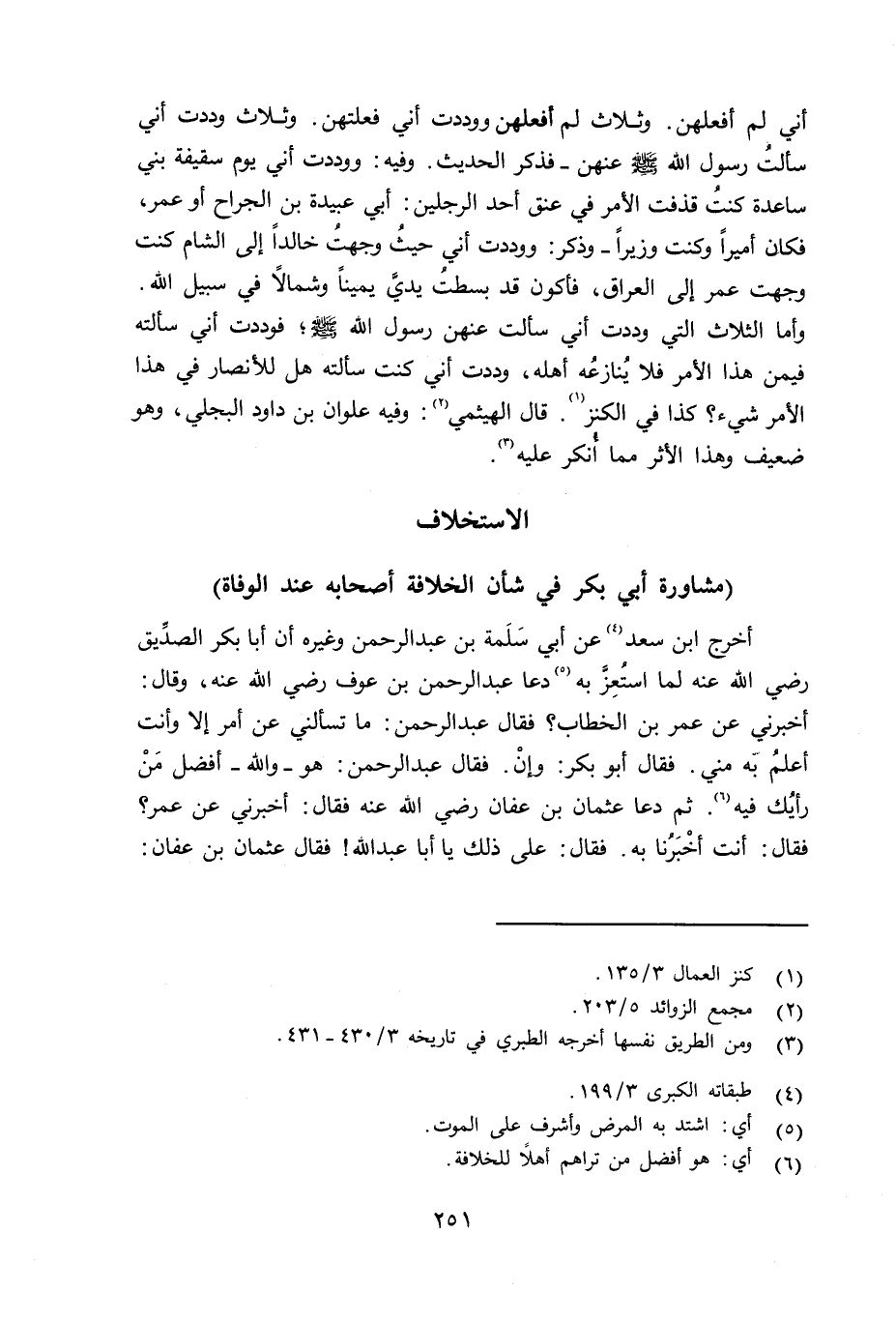 أني لم أفعلهن. وثلاث لم أفعلهن ووددت أني فعلتهن. وثلاث وددت أني سألت رسول الله صلى الله عليه وسلم عنهن - فذكر الحديث. وفيه: ووددت أني يوم سقيفة بني ساعدة كنت قذفت الأمر في عنق أحد الرجلين: أبي عبيدة بن الجراح أو عمر، فكان أميراً وكنت وزيراً - وذكر: ووددت أني حين وجهت خالداً إلى الشام كنت وجهت عمر إلى العراق، فأكون قد بسطت يديَّ يميناً وشمالاً في سبيل الله. وأما الثلاث التي وددت أني سألت عنهن رسول الله صلى الله عليه وسلم فوددت أني سألته فيمن هذا الأمر فلا يُنازَعُه أهله، وددت أني كنت سألته هل للأنصار في هذا الأمر شيء؟ كذا في الكنز. قال الهيثمي: وفيه علوان بن داود البجلي، وهو ضعيف وهذا الأثر مما أُنكر عليه.