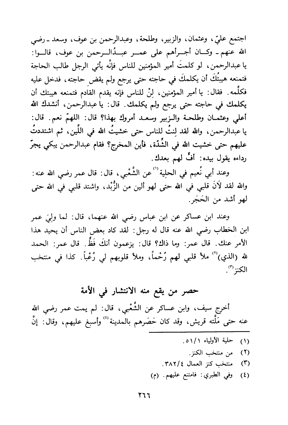 إجتمع عليّ، وعثمان، والزبير، وطلحة، وعبد الرحمن بن عوف، وسعد - رضي الله عنهم - وكان أجرأهم على عمر عبدُ الرحمن بن عوف قالوا: يا عبد الرحمن، لو كلمتَ أمير المؤمنين للناس فإنَّه يأتي الرجل طالب الحاجة فتمنعه هيبتك أن يكلمك في حاجته حتى يرجع ولم يقضِ حاجته، فدخل عليه فكلَّمه. فقال: يا أمير المؤمنين، لِنْ للناس فإنه يقدم القادم فتمنعه هيبتك أن يكلمك (في حاجته حتى يرجع ولم يكلمك) . قال: يا عبد الرحن، أنشدك الله أعلي، وعثمان، وطلحة، والزبير، وسعد أمروك بهذا؟ قال: اللهمّ نعم. قال: يا عبد الرحمن، والله لقد لنت للناس حتى خشيت الله في اللِّين، ثم اشتددت عليهم حتى خشيت الله في الشدّة، فأين المخرج؟ فقام عبد الرحمن يبكي يجرّ رداءه يقول بيده: أفَ لهم بعدك (أفَ لهم بعدك) .