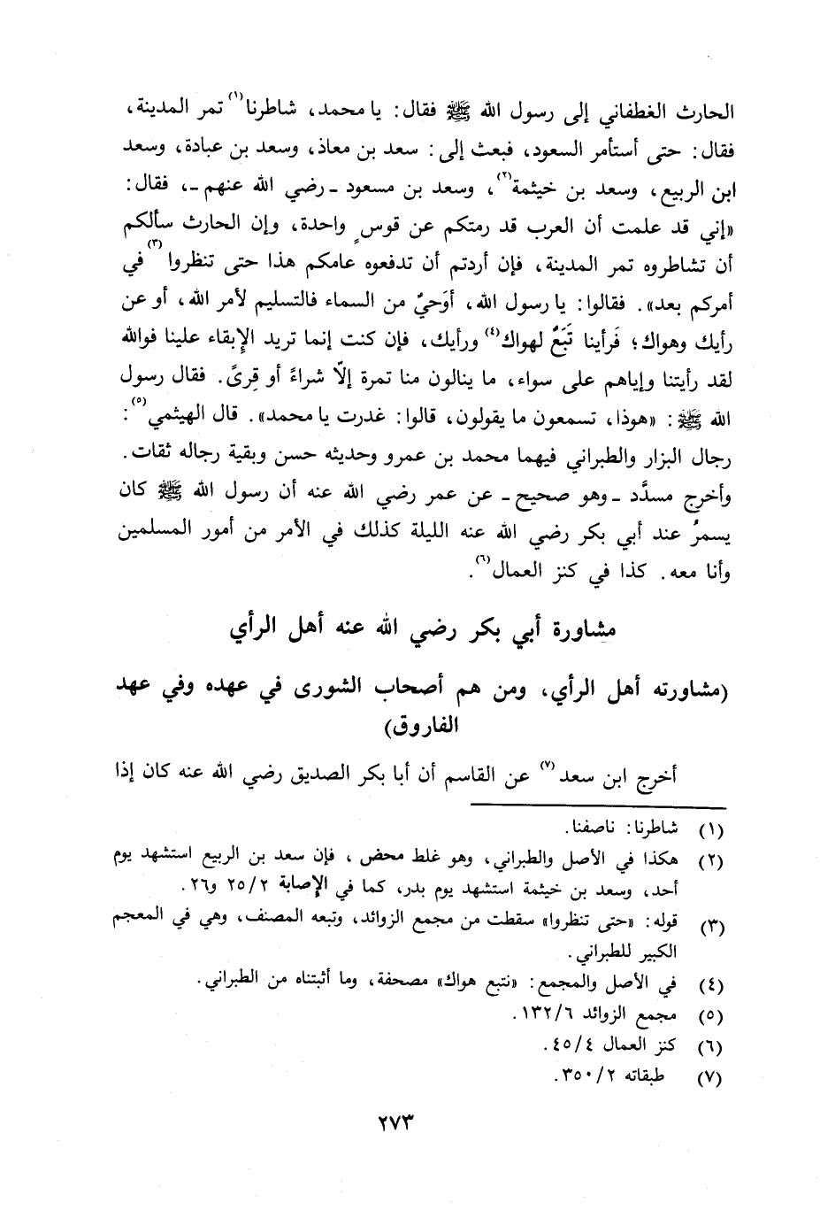 الحارث الغطفاني إلى رسول الله صلى الله عليه وسلم فقال: يا محمد، شاطرنا تمر المدينة، فقال: حتى استأمر السعود، فبعث إلى: سعد بن معاذ، سعد بن عبادة، سعد بن الربيع، وسعد بن خيثمة، سعد بن مسعود - رضي الله عنهم -، فقال: «إني قد علمت أن العرب قد رمتكم عن قوس واحدة، وإن الحارث سألكم تشاطروه تمر المدينة، فإن أردتم أن تدفعوه عامكم هذا في أمركم بعد» . فقالوا: يا رسول الله، أوَحيٌ من السماء فالتسليم لأمر الله، أو عن رأيك وهواك؛ فرأينا تَبَعُ هواك ورأيك، فإن كنت إنما تريد الإِبقاء علينا فوالله لقد رأيتنا وإياهم على سواء، ما ينالون منا تمرة إلا شراءً أو قِرىً. فقال رسول الله صلى الله عليه وسلم «هوذا، تسمعون ما يقولون، قالوا: غدرت يا محمد» . قال الهيثمي: رجال البزار، والطبراني فيهما محمد بن عمرو وحديثه حسن وبقية رجاله ثقات. وأخرج مسدَّد - وهو صحيح - عن عمر رضي الله عنه أن رسول الله صلى الله عليه وسلم كان يسمرُ عند أبي بكر رضي الله عنه الليلة كذلك في الأمر من أمور المسلمين وأنا معه. كذلك في كنز العمال.