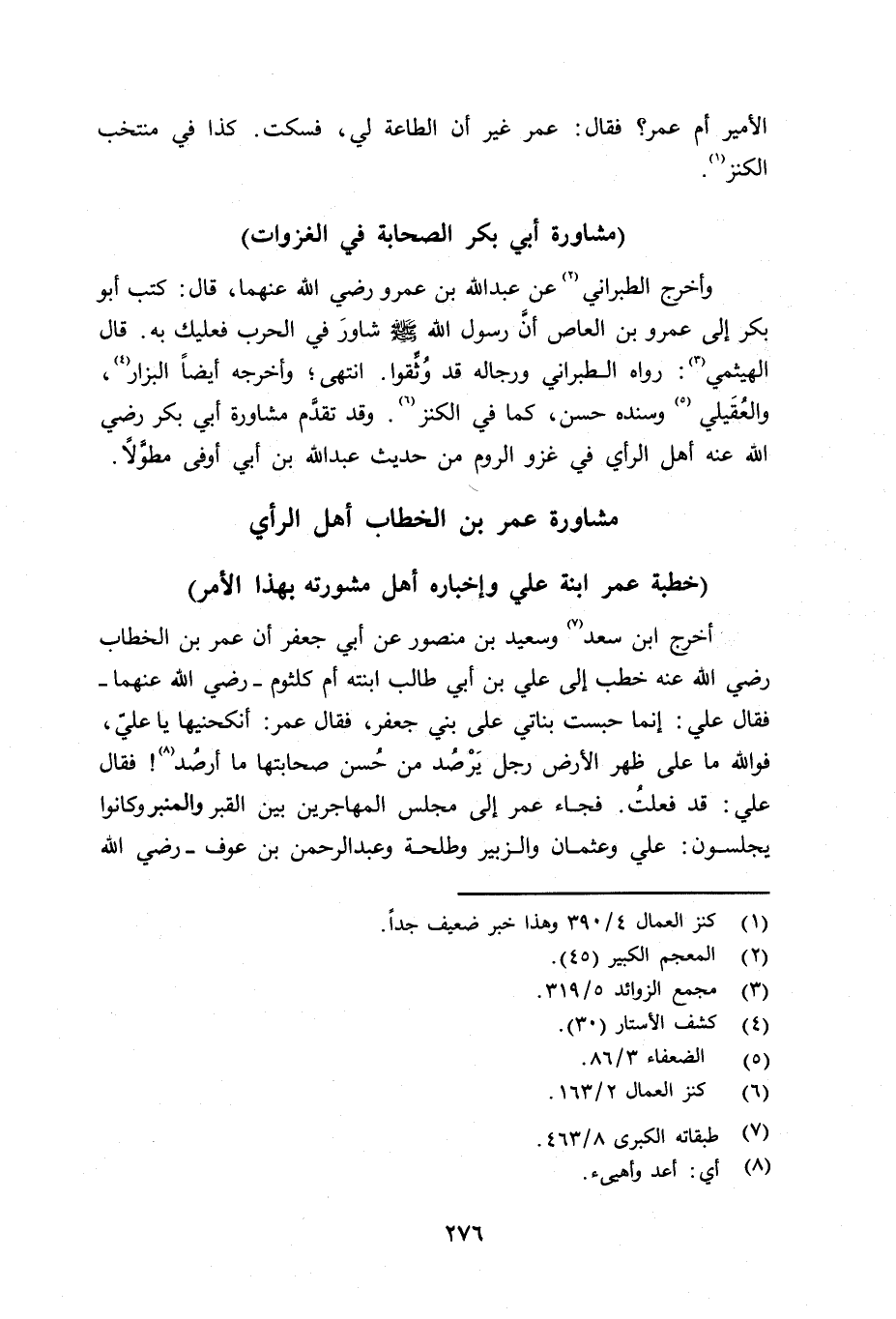 وأخرج الطبراني عن عبد الله بن عمرو رضي الله عنهما قال: كنت أبو بكر إلى عمرو بن العاص أنَّ رسول الله صلى الله عليه وسلم شاور في الحرب فعليك به. قال الهيثمي: رواه الطبراني ورجاله قد وُثِّقوا. انتهى؛ وأخرجه أيضاً البزار، والعُقَيلي وسنده حسن، كما في الكنز. وقد تقدَّم مشاورة أبي بكر رضي الله عنهم أهل الرأي في غزو الروم من حديث عبد الله بن أبي أوفى مطوَّلاً.