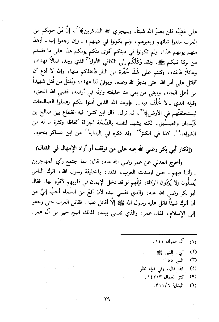 عَلَى عَقِبَيْهِ فَلَن يَضُرَّ اللَّهَ شَيْئاً وَسَيَجْزِى اللَّهُ الشَّاكِرِينَ} (آل عمران: 144) ، إِنَّ مَنْ حولكم من العرب منعوا شاتهم وبعيرهم، ولم يكونوا في دينهم؛ - وإن رجعوا إليه - أزهدَ منهم يومهم هذا، ولم تكونوا في دينكم أقوى منكم يومكم هذا على ما فقدتم من بركة نبيكم صلى الله عليه وسلم ولقد وَكَلَكُم إلى الكافي الأول الذي جده ضالاً فهداه، عائلاً فأغناه، وكنتم على شَفَا حُفْرة من النار فأنقذكم منها، والله لا أدع أن أقاتل على أمر الله حتى ينجزَ الله وعده، ويوفيَ لنا عهده؛ ويُقتلَ من قُتل شهيداً من أهل الجنة، ويبقى من بقي منا خليفته وارثَه في أرضه، قضى الله الحق؛ وقوله الذي - لا خُلْف فيه -: {وَعَدَ اللَّهُ الَّذِينَ ءامَنُواْ مِنْكُمْ وَعَمِلُواْ الصَّالِحَاتِ لَيَسْتَخْلِفَنَّهُمْ فِى الاْرْضِ} ، ثم نزل. قال ابن كثير: