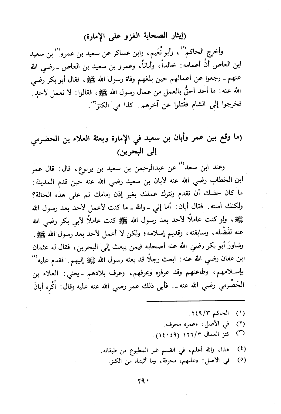 وعند ابن سعد عن عبد الرحمن بن سعيد بن يربوع قال: قال عمر بن الخطاب رضي الله عنه لأبان بن سعيد رضي الله عنه حين قدم المدينة: ما كان حقك أن تقدم وتترك عملك بغير إذن إِمامك ثم على هذه الحالة ولكنك آمنته. فقال أبان: أما إني - والله - ما كنت لأعمل لأحد بعد رسول الله صلى الله عليه وسلم ولو كنت عاملاً لأحد بعد رسول الله صلى الله عليه وسلم كنت عاملاً لأبي بكر رضي الله عنه لفَضْله، وسابقته، وقديم إسلامه؛ ولكن لا أعمل لأحد بعد رسول الله صلى الله عليه وسلم وشاور أبو بكر رضي الله عنه أصحابه فيمن يبعث إلى البحرين، فقال له عثمان بن عفان رضي الله عنه: إبعث رجلاً قد بعثه رسول الله صلى الله عليه وسلم إليهم. فقدم عليهم بإسلامهم، وطاعتهم وقد عرفوه وعرفهم، وعرف بلادهم - يعني: العلاء بن الحَضْرمي رضي الله عن -. فأبى ذلك عمر رضي الله عنه عليه وقال: أكره أبان