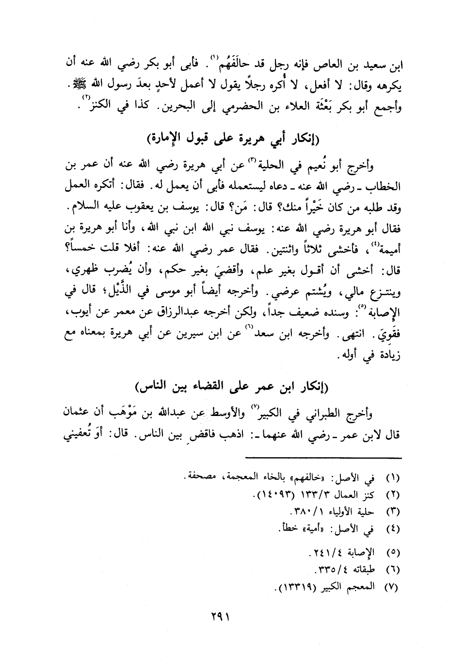وأخرج أبو نُعيم في الحلية عن أبي هريرة أن عمر بن الخطاب - رضي الله عنه - دعاه ليستعمله فأبى أن يعلم له. فقال: أتكره العلم وقد طلبه من كان خيراً منك؟ قال: من؟ قال: يوسف بن يعقوب عليه السلام. فقال أبو هريرة رضي الله عنه: يوسف نبي الله ابن نبي الله، وأنا أبو هريرة بن (أميمة) ، فأخشى ثلاثاً واثنتين. فقال عمر رضي الله عنه: أفلا قلت خمساً؟ قال: أخشى أن أقول بغير علم، وأقضيَ بغير حكم، وأن يُضرب ظهري، وينتزع مالي، ويُشتم عرضي. وأخرجه أيضاً أبو موسى في الذَّيْل؛ قال في الإِصابة: وسنده ضعيف جداً، ولكن أخرجه عبد الزرق عن معمر عن أيوب، فقَوِيَ. انتهى. وأخرجه ابن سعد عن ابن سيرين عن أبي هريرة بمعناه مع زيادة في أوله.