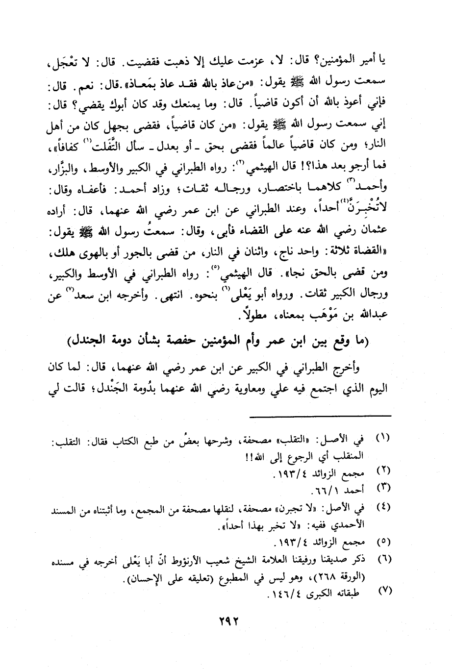 يا أمير المؤمنين؟ قال: لا، عزمت عليك إلا ذهبت فقضيت. قال: لا تعْجَل، سمعت رسول الله صلى الله عليه وسلم يقول: «من عاذ بالله فقد عاد بمَعاذ» . قال: نعم. قال: فإني أعوذ بالله أن أكون قاضياً. قال: وما يمنعك وقد كان أبوك يقضي؟ قال: إني سمعت رسول الله صلى الله عليه وسلم يقول: «من كان قاضياً، قضى بجهل كان من أهل النار؛ ومن كان قاضياً عالماً فقضى بحق - أو بعدل - سأل التقلب كفافاً» ، فما أرجو بعد هذا؟ قال الهيثمي: رواه الطبراني في الكبير والأوسط، والبزَّار، وأحمد وكلاهما باختصار، ورجاله ثقات؛ وزاد أحمد: فأعفاه وقال: لا تجبرن أحداً. وعند الطبراني عن ابن عمر رضي الله عنهما قال: أراده عثمان رضي الله عنه على القضاء فأبى وقال: سمعت رسول الله صلى الله عليه وسلم يقول: «القضاة ثلاثة: واحد ناجِ، واثنان في النار، من قضى بالجور أو بالهوى هلك، ومن قضى بالحق نجا» . قال الهيثمي: رواه الطبراني في الأوسط والكبير، ورجال الكبير ثقات. ورواه أبو يَعْلى بنحوه. انتهى. وأخرجه ابن سعد عن عبد الله بن مَوْهَب بمعناه مطولاً.