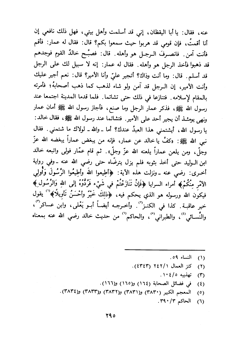 عنه، فقال: يا أبا اليقظان، إني قد أسلمت وأهل بيتي، فهل ذلك نافعي إن أنا أقمت، فإن قومي قد هربوا حيث سمعوا بكم؟ قال: فقال له عمار: فأقم فأنت آمن.k فانصرف الرجل هو وأهله. قال: فصيَّح خالد القوم فوجدهم قد ذهبوا فأخذ الرجل هو وأهله. فقال له عمار: إنه لا سبيل لك على الرجل قد أسلم. قال: وما أنت وذاك؟ أتجير عليّ وأنا الأمير؟ قال: نعم أجير عليك وأنت الأمير، إن الرجل قد آمن لو شاء لذهب كما ذهب أصحابه؛ فأمرته بالمقام لإِسلامه فتنازعا في ذلك حتى تشاتما. فلما قدما المدينة إجتمعا عند رسول الله صلى الله عليه وسلم فذكر عمار الرجل وما صنع، فأجاز رسول الله صلى الله عليه وسلم أمان عمار ونهى يومئذٍ أن يجير أحد على الأمير. فتشاتما عند رسول الله صلى الله عليه وسلم فقال خالد: يا رسول الله، أيشتمني هذا العبد عندك؟ أما - والله - لولاك ما شتمني. فقال نبي الله صلى الله عليه وسلم «كفَّ يا خالد عن عمار، فإنه من يبغض عماراً يبغضه الله عزّ وجلّ، ومن يلعن عماراً يلعنه الله عزّ وجلّ» . ثم قام عمّار فولى واتبعه خالد بن الوليد حتى أخذ بثوبه فلم يزل يترضّاه حتى رضي الله عنه - وفي رواية أخرى: رضي عنه - ونزلت هذه الآية: {أَطِيعُواْ اللَّهَ وَأَطِيعُواْ الرَّسُولَ وَأُوْلِى الاْمْرِ مِنْكُمْ} (النساء: 59) أمراء السرايا {فَإِن تَنَازَعْتُمْ فِى شَىْء فَرُدُّوهُ إِلَى اللَّهِ