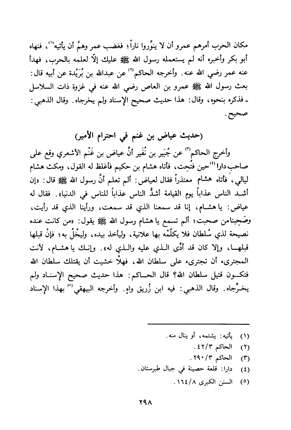 وأخرج الحاكم عن جُبَير بن نُفَير أنَّ عياض بن غُنْم الأشعري وقع على صاحبِ دارا حين فتحت، فأتاه هشام بن حكيم فأغلظ له القول، ومكث هشام ليالي، فأتاه معتذراً فقال لعياض ألم تعلم أنَّ رسول الله صلى الله عليه وسلم قال: «إن أشد الناس عذاباً يوم القيامة أشدُّ الناس عذاباً للناس في الدنيا» . فقال له عياش: يا هشام، إنا قد سمعنا الذي قد سمعت، ورأينا الذي قد رأيت، وصحبنا من صحبت؛ ألم تسمع يا هشام رسول الله صلى الله عليه وسلم يقول: «من كانت عنده نصيحة لذي سلطان فلا يكلّمْه بها علانية، وليأخذ بيده، وليخْلُ به؛ فإنْ قبلها قبلها، وإِلا كان قد أدَّى الذي عليه والذي له» . وإنك يا هشام، لأنت المجترىء أن تجترىء على سلطان الله، فهلا خشيت أن يقتلك سلطان الله فتكون قتيل سلطان الله؟ قال الحاكم: هذا حديث صحيح الإِسناد لم يخرِّجاه. وقال الذهبي: فيه ابن زريق واهٍ. وأخرجه البيهقي بهذا الإِسناد