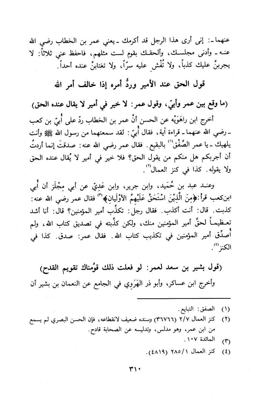 أخرج ابن راهَوَيْه عن الحسن أنَّ عمر بن الخطاب ردّ عن أُبيّ بن كعب - رضي الله عنهما - قراءة آية، فقال أبيّ: لقد سمعتها من رسول الله صلى الله عليه وسلم وأنت يلهيك - يا عمر - الصَّفْق بالبقيع. فقال عمر رضي الله عنه: صدقت إنما أردت أن أجربكم هل منكم من يقول الحق؟ فلا خير في أمير لا يُقال عنده الحق ولا يقوله. كذا في كنز العمال.