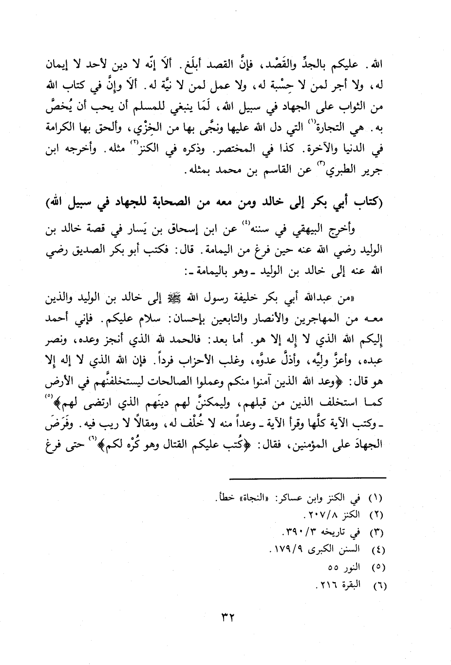 من عبد الله أبي بكر خليفة رسول الله صلى الله عليه وسلم إلى خالد بن الوليد والذين معه من المهاجرين والأنصار والتابعين بإحسان: سلام عليكم. فإني أحمد إِليكم الله الذي لا إِله إلا هو. أَما بعد: فالحمد لله الذي أنجز وعده، ونصر عبده، وأعزَّ ولِيَّه، وأذلَّ عدوَّه، وغلب الأحزاب فرداً. فإن الله الذي لا إله إِلا هو قال: {وَعَدَ اللَّهُ الَّذِينَ ءامَنُواْ مِنْكُمْ وَعَمِلُواْ الصَّالِحَاتِ لَيَسْتَخْلِفَنَّهُمْ فِى الاْرْضِ كَمَا اسْتَخْلَفَ الَّذِينَ مِن قَبْلِهِمْ وَلَيُمَكّنَنَّ لَهُمْ دِينَهُمُ الَّذِى ارْتَضَى لَهُمْ} (النور: 55) - وكتب الآية كلَّها وقرأ الآية - وعداً منه لا خُلْف له، ومقالاً لا ريب فيه. وفرض الجهاد على المؤمنين، فقال: {كُتِبَ عَلَيْكُمُ الْقِتَالُ وَهُوَ كُرْهٌ لَّكُمْ} (البقرة: 216) - حتى فرغ