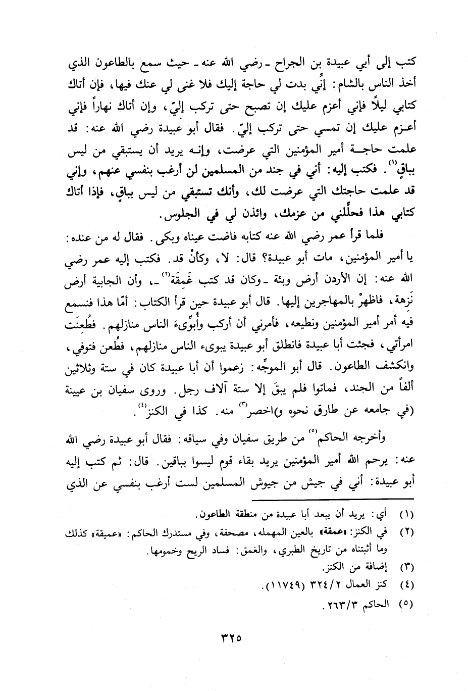 وأخرجه الحاكم من طريق سفيان وفي سياقه: فقال أبو عبيدة رضي الله عنه: يرحم الله أمير المؤمنين يريد بقاء قوم ليسوا بباقين. قال: ثم كتب إليه أبو عبيدة: إِني في جيش من جيوش المسلمين لست أرغب بنفسي عن الذي