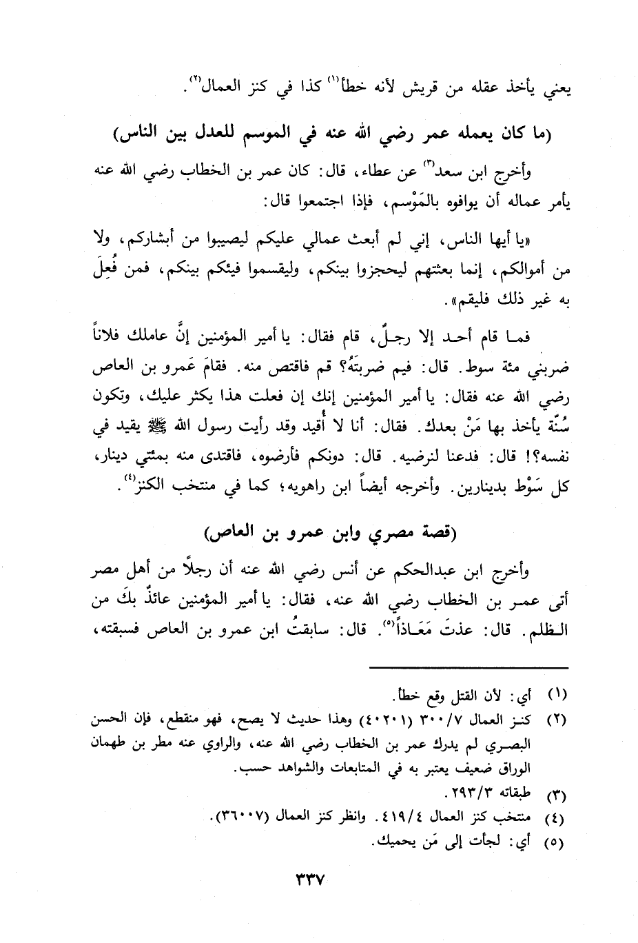 فما قام أحد إلا رجل، قام فقال: يا أمير المؤمنين إِنَّ عاملك فلاناً ضربني مائة سوط. قال: فيم ضربته؟ قم فاقتص منه. فقام عمرو بن العاص رضي الله عنه فقال: يا أمير المؤمنين إنك إن فعلت هذا يكثر عليك، وتكن سنّة يأخذ بها مَنْ بعدك. فقال: أنا لا أُقيد وقد رأيت رسول الله صلى الله عليه وسلم يقيد في نفسه؟ قال: فدعنا لنرضيه. قال: دونكم فأرضوه، فافتدى منه بمائتي دينار عن كل سَوْط بدينارين. وأخرجه أيضاً ابن راهويه؛ كما في منتخب الكنز.