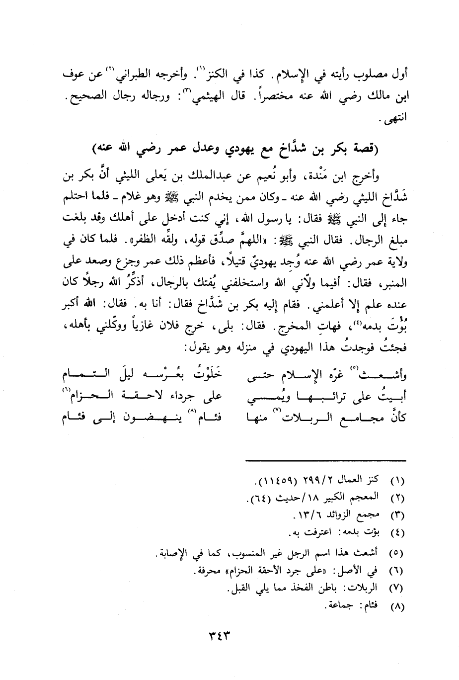 وأخرج ابن مَنْده، وأبو نُعيم عن عبد الملك بن يَعلى الليثي أنَّ بكر بن شَدَّاخ الليثي رضي الله عنه - وكان ممن يخدم النبي صلى الله عليه وسلم وهو غلام - فلما احتلم جاء إِلى النبي صلى الله عليه وسلم فقال: يا رسول الله، إني كنت أدخل على أهلك وقد بلغت مبلغ الرجال. فقال النبي صلى الله عليه وسلم «اللهَّم صدِّق قوله، ولقِّه الظفر» . فلما كان في ولاية عمر رضي الله عنه وُجِد يهوديٌ قتيلاً، فأعظم ذلك عمر وجزع وصعد على المنبر فقال: أفيما ولاني الله واستخلفني يُفتك بالرجال، أذكِّرُ الله رجلاً كان عنده علم إِلا أعلمني. فقام إِليه بكر بن شدَّاخ قال: أنا به. فقال: الله أكبر بُؤْتَ بدمه. فهاتِ المخرج. فقال: بلى، خرج فلان غازياً ووكّلني بأهله، فجئت فوجدت هذا اليهودي في منزله وهو يقول: