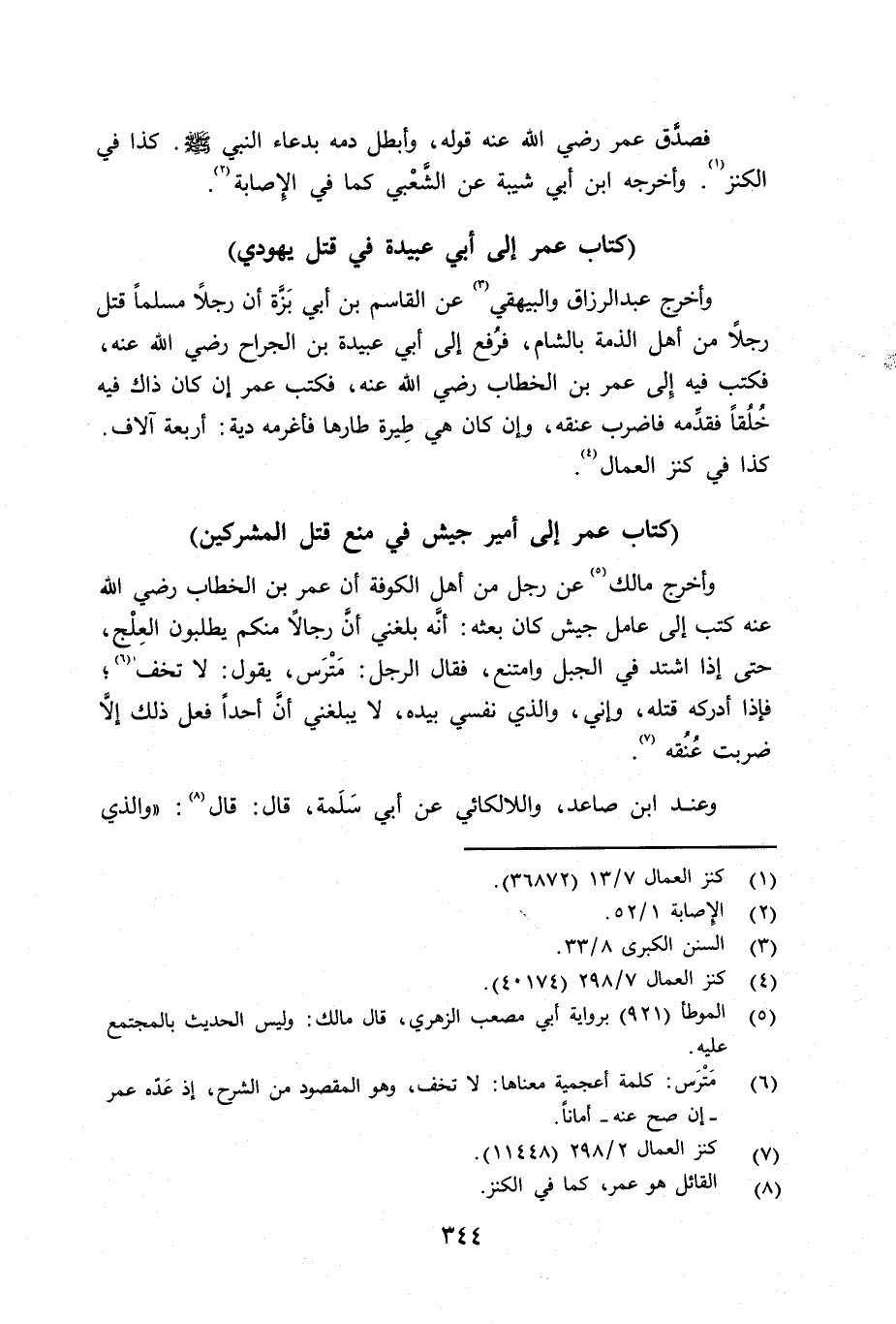 وأخرج مالك عن رجل من أهل الكوفة أن عمر بن الخطاب رضي الله عنه كتب إلى عامل جيش كان بعثه: أنَّه بلغني أنَّ رجالاً منكم يطلبون العِلْج، حتى إذا اشتد في الجبل وامتنع، فقال الرجل: - مترس -، يقول: لا تخف؛ فإذا أدركه قتله، وإني - والذي نفسي بيده - لا يبلغني أنَّ أحداً فعل ذلك إلا ضربت عنقه. وعند ابن صاعد، واللألكائي عن أبي سَلَمة قال: قال: «والذي