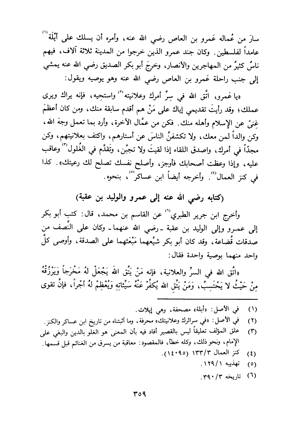 وأخرج ابن جرير الطبري عن القاسم بن محمد قال: كتب أبو بكر إِلى عمرو وإِلى الوليد بن عقبة - رضي الله عنهما - وكان على النِّصف من صدقات قُضاعة، وقد كان أبو بكر شيَّعهما مَبْعَثهما على الصدقة، وأوصى كل واحد منهما بوصية واحدة فقال:
