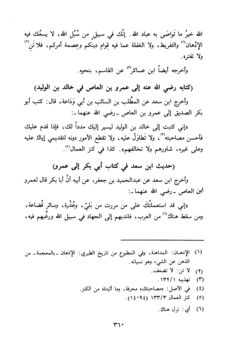 حديث ابن سعد في كتاب أبي بكر إِلى عمرو