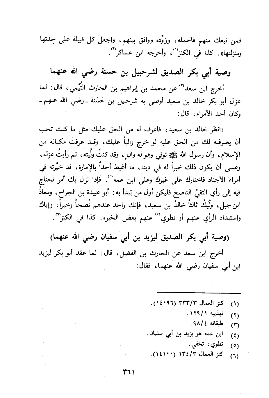 أخرج ابن سعد عن محمد بن إبراهيم بن الحارث التَّيْمي رضي الله عنه قال: لما عزل أبو بكر خالد بن سعيد أوصى به شرحبيل بن حسنة - رضي الله عنهم - وكان أحد الأمراء قال: