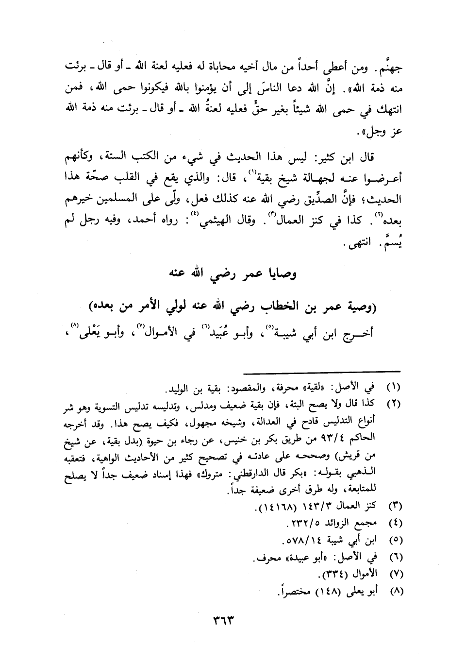 قال ابن كثير: ليس هذا الحديث في شيء نالكتب الستة، وكأنهم أعرضوا عنه لجهالة شيخ لقيه، قال: والذي يقع في القلب صحّة هذا الحديث؛ فإنَّ الصدِّيق رضي الله عنه كذلك فعل، ولّى على المسلمين خيرهم بعده. كذا في كنز العمال. وقال الهيثمي: رواه أحمد، وفيه رجل لم يُسمَّ. انتهى.