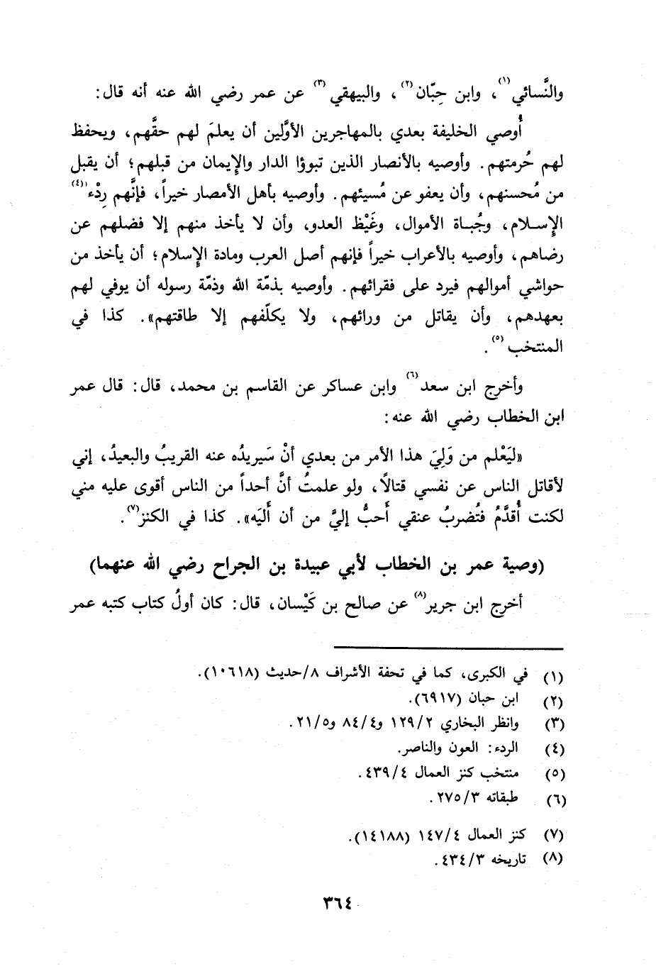 «أُوصي الخليفة بعدي بالمهاجرين الأوَّلين أن يعلم لهم حقَّهم، ويحفظ لهم حرمتهم. وأوصيه بالأنصار الذين تبوؤا الدار والإِيمان من قبلهم؛ أن يقبل من محسنهم، وأن يعفو عن مسيئهم. وأوصيه بأهل الأمصار خيراً، فإنَّهم رِدْء الإِسلام، وجُباة الأموال، وغَيْظ العدو، وأن يأخذ منهم إلا فضلهم عن رضاهم، وأوصيه بالأعراب خيراً فإنهم أصل العرب ومادة الإِسلام؛ أن يأخذ من حواشي أموالهم فيرد على فقرائهم. وأوصيه بذمّة الله وذمّة رسوله أن يوفي لهم بعهدهم، وأن يقاتل من ورائهم، ولا يكلَّفهم إلا طاقتهم» .