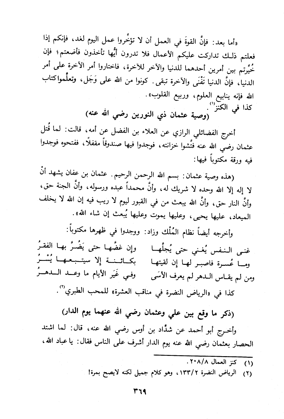 g «هذه وصية عثمان: بسم الله الرحمن الرحيم. عثمان بن عفان يشهد أنْ لا إله إلا الله وحده لا شريك له، وأنَّ محمداً عبده ورسوله، وأنَّ الجنة حق، وأنَّ النار حق، وأنَّ الله يبعث من في القبور ليوم لا ريب فيه إن الله لا يخلف الميعاد، عليها يحيي، وعليها يموت وعليها يُبعث إن شاء الله» .