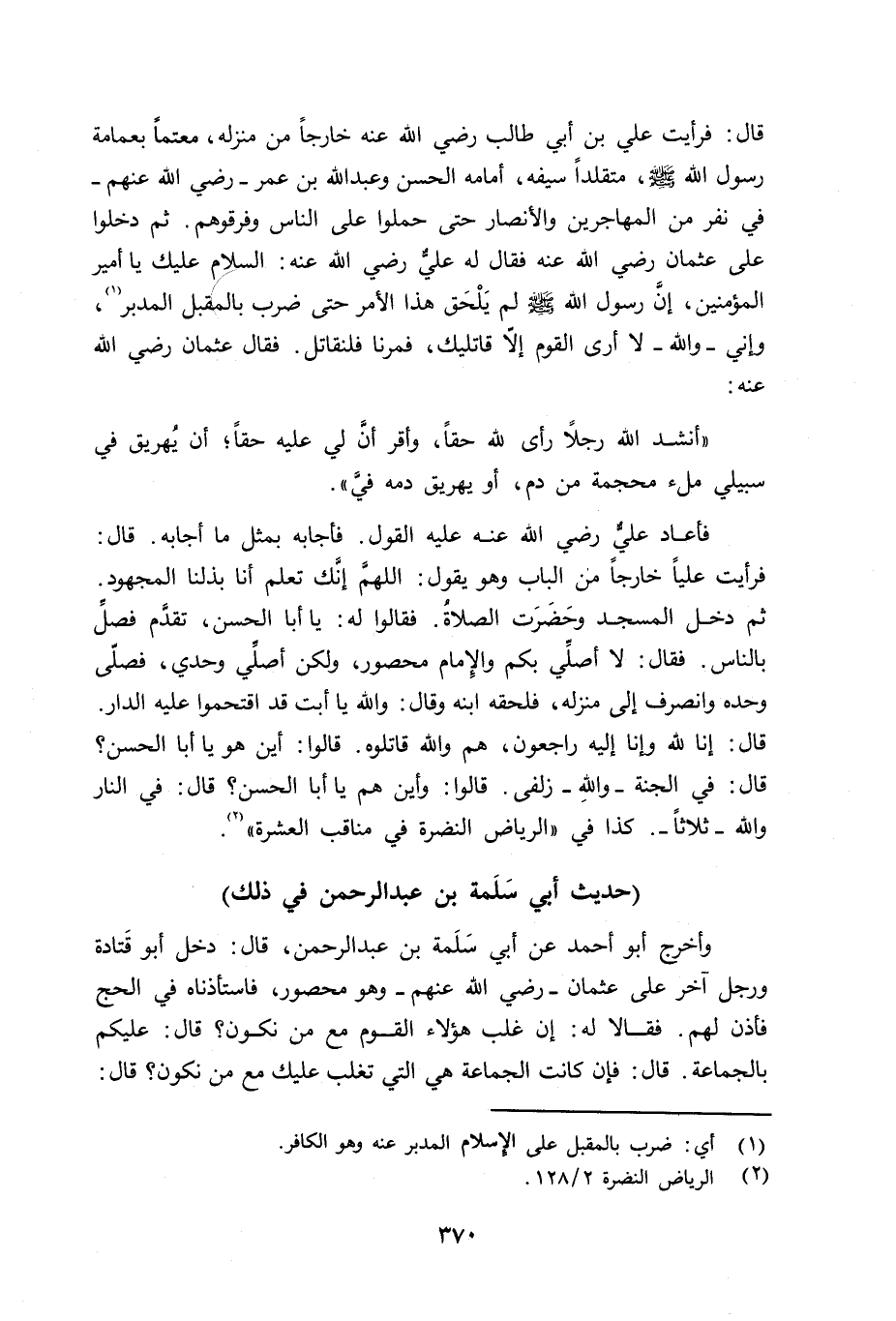 قال: فرأيت علي بن أبي طالب رضي الله عنه خارجاً من منزله، معتماً بعمامة رسول الله، متقلداً سيفه، أمامه الحسن عبد الله بن عمر - رضي الله عنهم - في نفر من المهاجرين والأنصار حتى حملوا على الناس وفرقوهم. ثم دخلوا على عثمان رضي الله عنه فقال له عليٌّ رضي الله عنه: السلام عليك يا أمير المؤمنين، إنَّ رسول الله صلى الله عليه وسلم لم يَلْحَق هذا الأمر حتى ضرب بالمقبل المدبر، وإني - والله - لا أرى القوم إلا قاتليك، فمرنا فلنقاتل. فقال عثمان رضي الله عنه: