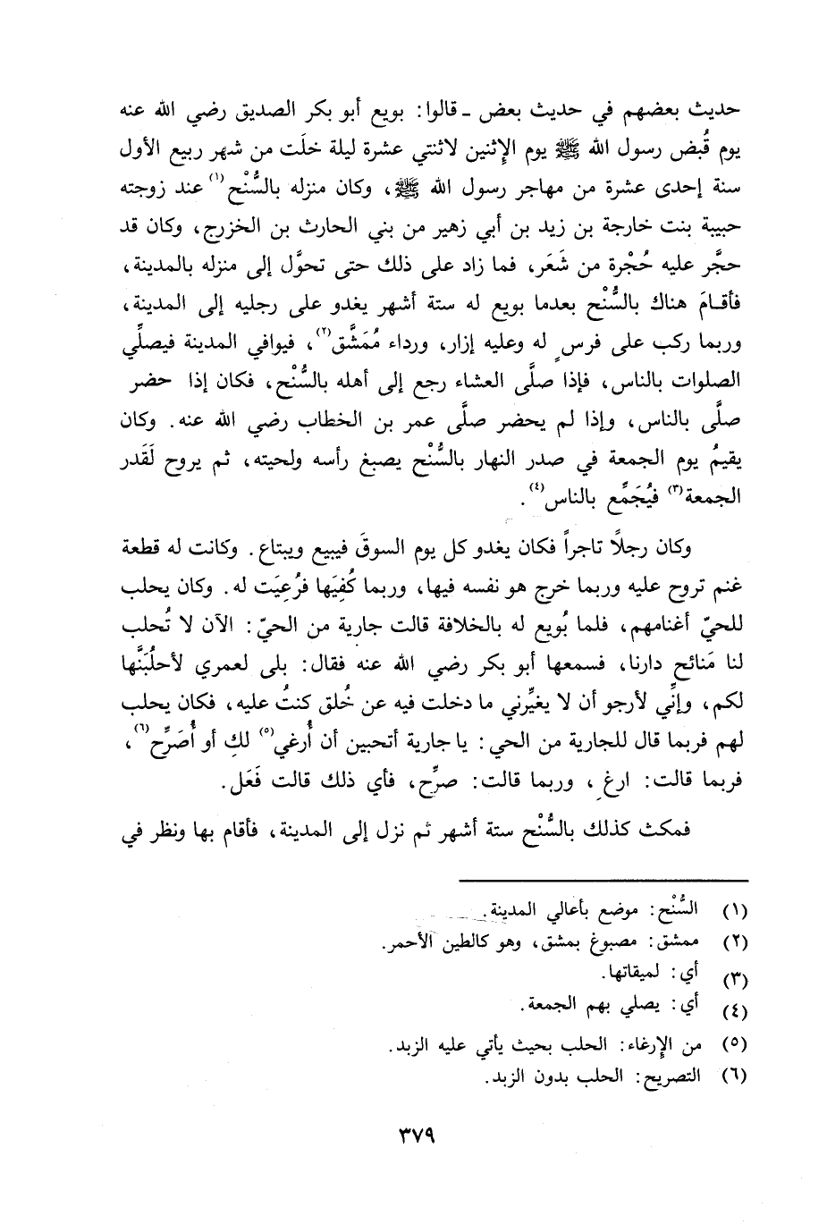 حديث بعضهم في حديث بعض - قالوا: بويع أبو بكر الصديق رضي الله عنه يوم قُبض رسول الله صلى الله عليه وسلم يوم الإِثنين لاثنتي عشرة ليلة خلَت من شهر ربيع الأول سنة إحدى عشرة من مهاجر رسول الله صلى الله عليه وسلم وكان منزله بالسُّنْح عند زوجته حبيبة بنت خارجة بن زيد بن أبي زهير من بني الحارث بن الخزرج، وكان قد حجَّر عليه حُجْرة من شعر، فما زاد على ذلك حتى تحوَّل إلى منزله بالمدينة، فأقام هناك بالسُّنْح بعدما بويع له ستة أشهر يغدو على رجليه إلى المدينة، وربما ركب على فرس له وعليه إزار، ورداء مُمَشَّق، فيوافي المدينة فيصلِّي الصلوات بالناس، فإذا صلَّى العشاء رجع إلى أهله بالسُّنْح، فكان إذا حضر صلَّى بالناس، وإذا لم يحضر صلَّى عمر بن الخطاب رضي الله عنه. وكان يقوم يوم الجمعة في صدر النهار بالسُّنْح يصبغ رأسه ولحيته، ثم يروح لَقَدر الجمعة فيُجَمِّع بالناس.