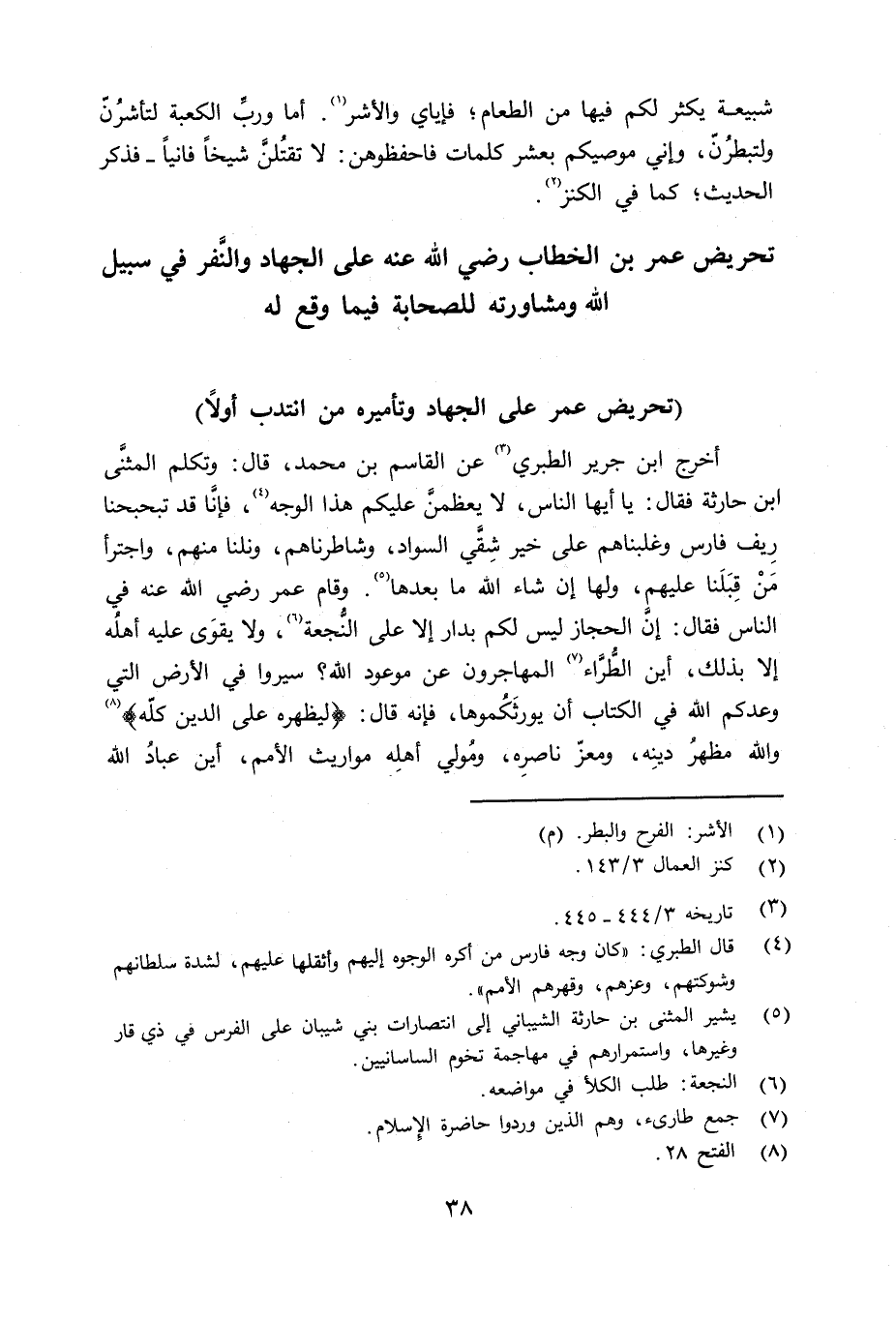 أخرج ابن جرير الطبري عن القاسم بن محمد قال: وتكلم المثنَّى بن حارثة فقال: يا أيها الناس، لا يعظمنَّ عليكم هذا الوجه، فإنَّا قد تبحبحنا رِيف فارس وغلبناهم على خير شِقَّي السواد، وشاطرناهم، ونلنا منهم، واجترأ مَنْ قِبَلَنا عليهم، ولها إن شاء الله ما بعدها. وقام عمر رضي الله عنه في الناس فقال: إنَّ الحجاز ليس لكم ب دار إلا على النُّجعة، ولا يقوَى عليه أهلُه إلا بذلك، أين الطُّراء المهاجرون عن موعود الله؟ سيروا في الأرض التي وعدكم الله في الكتاب أن يورثَكُموها، فإنه قال: {لِيُظْهِرَهُ عَلَى الدّينِ كُلّهِ} (الفتح: 28) والله مظهرُ دينه، ومعزّ ناصرِه، ومُولي أهلِه مواريث الأمم، أين عبادُ الله