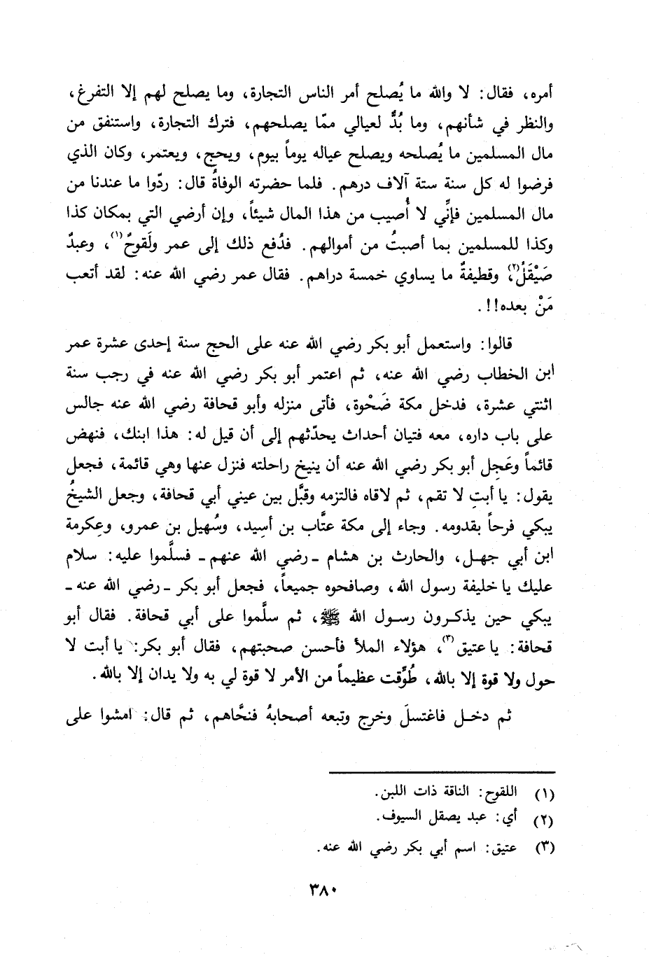 أمره، فقال: لا والله ما يُصلح أمر الناس التجارة، وما يصلح لهم إلا التفرغ، والنظر في شأنهم، وما بُدٌّ لعيالي ممّا يصلحهم، فترك التجارة، واستنفق من مال المسلمين ما يصلحه ويصلح عياله يوماً بيوم، ويحج، ويعتمر، وكان الذي فرضوا له كل سنة ستة آلاف درهم. فلما حضرته الوفاة قال: ردّوا ما عندنا من مال المسلمين فإنِّي لا أُصيب من هذا المال شيئاً، وإِن أرضي التي بمكان كذا وكذا للمسلمين بما أصبت من أموالهم. فدُفع ذلك إلى عمر ولَقوح، وعبد صَيْقَل، وقطيفة ما يساوي خمسة دراهم. فقال عمر رضي الله عنه: لقد أتعب مَنْ بعده.