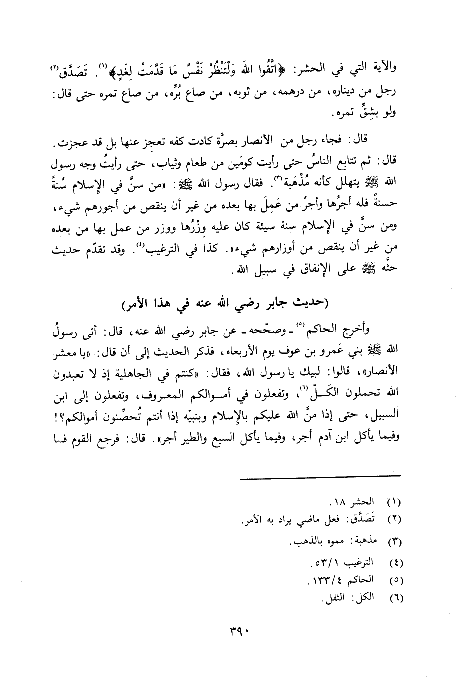 وأخرج الحاكم - وصحّحه - عن جابر رضي الله عنه قال: أتى رسولُ الله صلى الله عليه وسلم بني عمرو بن عوف يوم الأربعاء، فذكر الحديث إلى أن قال: «يا معشر الأنصار» ، قالوا: لبيك يا رسول الله، فقال: «كنتم في الجاهلية إذ لا تعبدون الله تحملون الكَلّ، وتفعلون في أموالكم المعروف، وتفعلون إلى ابن السبيل، حتى إذا منَّ الله عليكم بالإِسلام وبنبيّه إذا أنتم تُحصِّنون أموالكم؟ فيما يأكل ابن آدم آجر، وفيما يأكل السبع والطير أجر» . قال: فرجع القوم فما