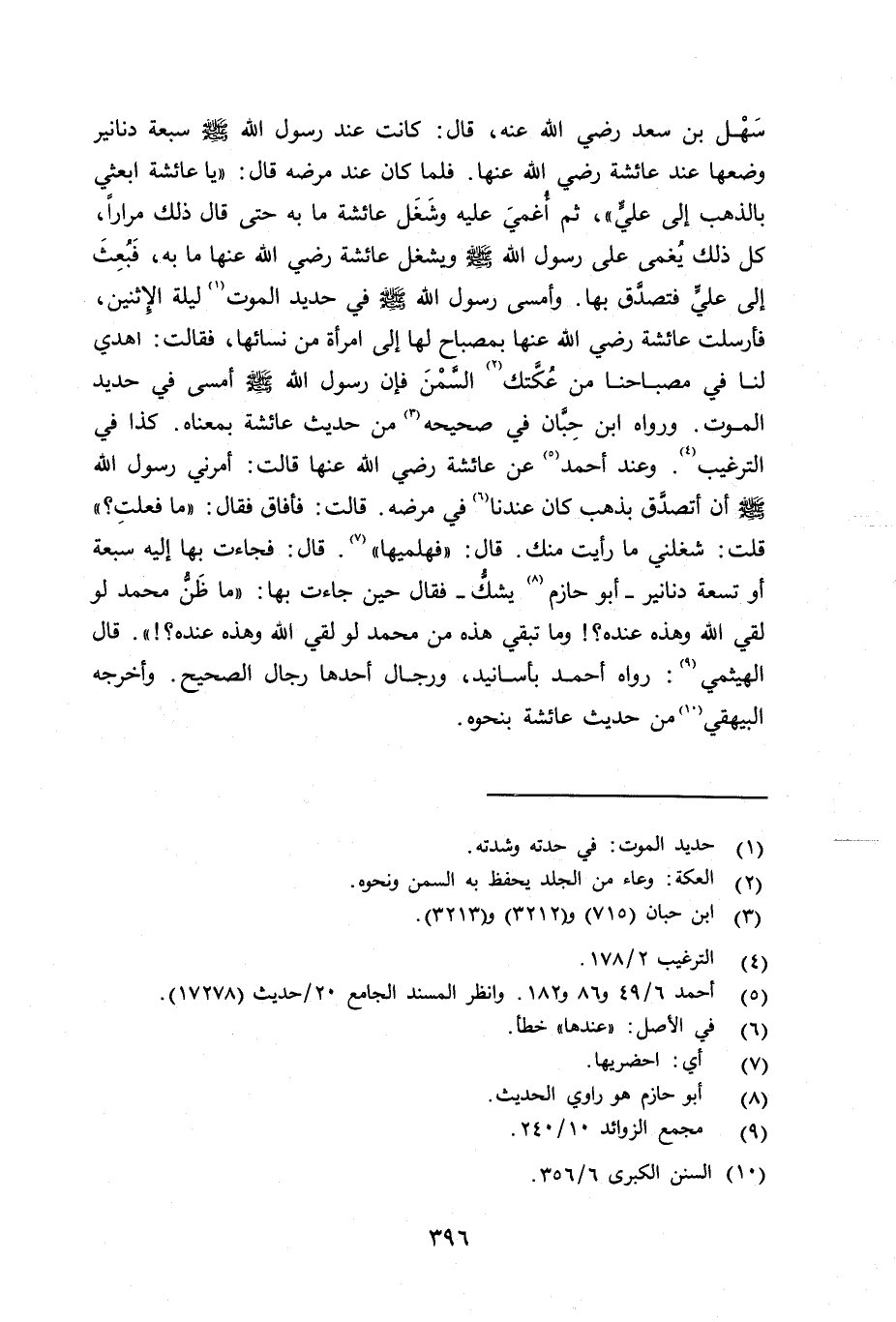 سهل بن سعد رضي الله عنه قال: كانت عند رسول الله صلى الله عليه وسلم سبعة دنانير وضعها عند عائشة رضي الله عنها. فلما كان عند مرضه قال: «يا عائشة إبعثي بالذهب إلى عليَ» ، ثم أُغميَ عليه وشَغَل عائشة ما به حتى قال ذلك مراراً، كل ذلك يُغمى على رسول الله صلى الله عليه وسلم ويشغل عائشة رضي الله عنها ما به، فبعث إلى عليَ فتصدَّق بها. وأمسى رسول الله صلى الله عليه وسلم في حديد الموت ليلة الإِثنين، فأرسلت عائشة رضي الله عنها بمصباح لها إلى إمرأة من نسائها، فقالت: أهدي لنا في مصباحنا من عُكَّتك السَّمْنَ فإن رسول الله صلى الله عليه وسلم أمسى في حديد الموت. ورواه ابن حِبَّان في صحيحه من حديث عائشة بمعناه. كذا في الترغيب. عند أحمد عن عائشة رضي الله عنها قالت: أمرني رسول الله صلى الله عليه وسلم أن أتصدَّق بذهب كان عندنا في مرضه. قالت: فأفاق فقال: «ما فعلتِ؟» قلت: (لقد) شغلني ما رأيت منك. قال: «فهلميها» . قال: فجاءت بها إِليه سبعة أو تسعة دنانير - أبو حازم يشكُّ - فقال حين جاءت بها: «ما ظَنُّ محمد (أن) لو لقي الله (عزّ وجلّ) وهذه عنده؟ وما تبقي هذه من محمد لو لقي الله وهذه عنده؟» . قال الهيثمي: رواه أحمد بأسانيد، ورجال أحدها رجال الصحيح. وأخرجه البيهقي من حديث عائشة بنحوه.