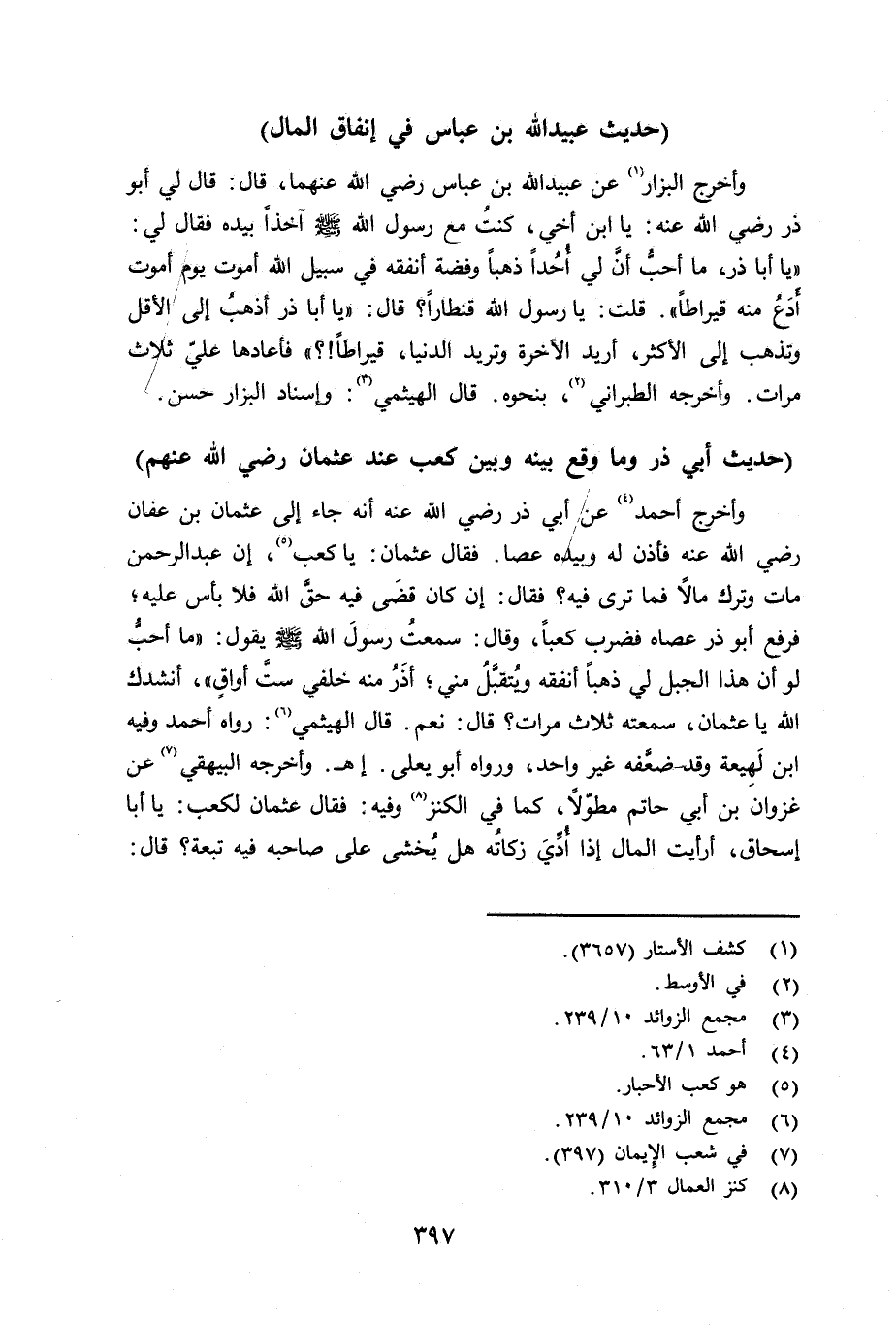 وأخرج أحد عن أبي ذر رضي الله عنه أنه جاء إلى عثمان بن عفان رضي الله عنه فأذن له بيده عصا. فقال عثمان: يا كعب، إن عبد الرحمن مات وترك مالاً فما ترى فيه؟ فقال: إن كان قضَى فيه حقَّ الله فلا بأس عليه؛ فرفع أبو ذر عصاه فضرب كعباً وقال: سمعت رسول الله صلى الله عليه وسلم يقول: «ما أحبُّ لو أن هذا الجبل لي ذهباً أنفقه ويُتقبَّلُ مني؛ أذَرُ منه خلفي ستَّ أواقٍ» ، أنشدك الله يا عثمان، سمعته ثلاث مرات؟ قال: نعم. قال الهيثمي: رواه أحمد وفيه ابن لَهِيعة وقد ضعَّفه غير واحد، ورواه أبو يعلى. اهـ. وأخرجه البيهقي عن غزوان بن أبي حاتم مطوّلاً، كما في الكنز وفيه: فقال عثمان لكعب: يا أبا إسحاق، أرأيت المال إذا أُدِّيَ زكاتُه هل يُخشى على صاحبه فيه تبعة؟ قال: