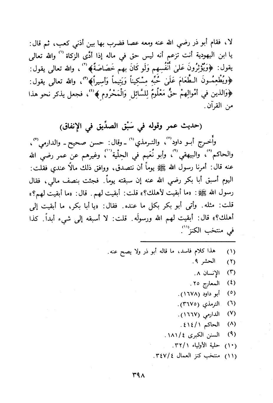 لا، فقام أبو ذر رضي الله عنه معه عصا فضرب بها بين أذني كعب، ثم قال: يا ابن اليهودية أنت تزعم أنه ليس حق في ماله إذا أدَّى الزكاة والله تعالى يقول: {وَيُؤْثِرُونَ عَلَى أَنفُسِهِمْ وَلَوْ كَانَ بِهِمْ خَصَاصَةٌ} (الحشر: 9) ، والله تعالى يقول: {وَيُطْعِمُونَ الطَّعَامَ عَلَى حُبّهِ مِسْكِيناً وَيَتِيماً وَأَسِيراً} (الإنسان: 8) ، الله تعالى يقول: {وَالَّذِينَ فِى أَمْوالِهِمْ حَقٌّ مَّعْلُومٌ لّلسَّآئِلِ وَالْمَحْرُومِ} (المعارج: 24، 25) ، فجعل يذكر نحو هذا من القرآن.