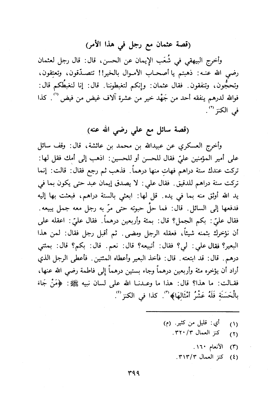 وأخرج البيهقي في شُعَب الإِيمان عن الحسن قال: قال رجل لعثمان رضي الله عنه: ذهبتم يا أصحاب الأموال بالخير تتصدّقون، وتعتِقون، وتحجُّون، وتنفقون. فقال عثمان: وإِنكم لتغبطوننا. قال: إنا لنغبطُكم قال: فوالله لدرهم ينفقه أحد من جَهْد خير من عشرة آلاف غيض من فيض. كذا في الكنز.